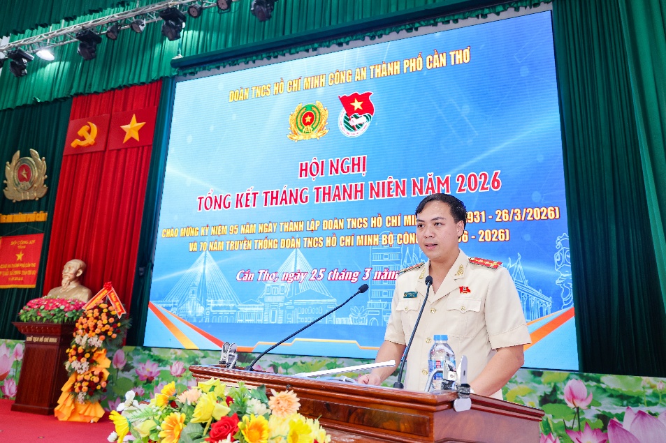 Tại hội nghị, Đại úy Nguyễn Tuấn Ngô, Trưởng Ban Thanh niên Công an thành phố Cần Thơ đã trình bày diễn văn ôn lại truyền thống 95 năm xây dựng, trưởng thành của Đoàn Thanh niên Cộng sản Hồ Chí Minh (26/3/1931 - 26/3/2026) và 70 năm truyền thống Đoàn Thanh niên Cộng sản Hồ Chí Minh Bộ Công an. Qua đó nhấn mạnh, qua các thời kỳ cách mạng, tổ chức Đoàn luôn là lực lượng xung kích, đội dự bị tin cậy của Đảng, không ngừng lớn mạnh, đóng góp quan trọng vào sự nghiệp đấu tranh giải phóng dân tộc, xây dựng và bảo vệ Tổ quốc. Đối với tuổi trẻ Công an nhân dân, trải qua 70 năm xây dựng và trưởng thành, các thế hệ đoàn viên, thanh niên luôn phát huy tinh thần “đâu cần thanh niên có, việc gì khó có thanh niên”, xung kích trên các mặt công tác, lập nhiều chiến công, thành tích xuất sắc, góp phần giữ vững an ninh quốc gia, bảo đảm trật tự an toàn xã hội. Tiếp nối truyền thống vẻ vang đó, tuổi trẻ Công an thành phố Cần Thơ hôm nay tiếp tục nỗ lực rèn luyện bản lĩnh chính trị, nâng cao trình độ chuyên môn, nghiệp vụ, xung kích, sáng tạo trong thực hiện nhiệm vụ, góp phần xây dựng lực lượng Công an thành phố chính quy, tinh nhuệ, hiện đại, vì cuộc sống bình yên, hạnh phúc của Nhân dân.