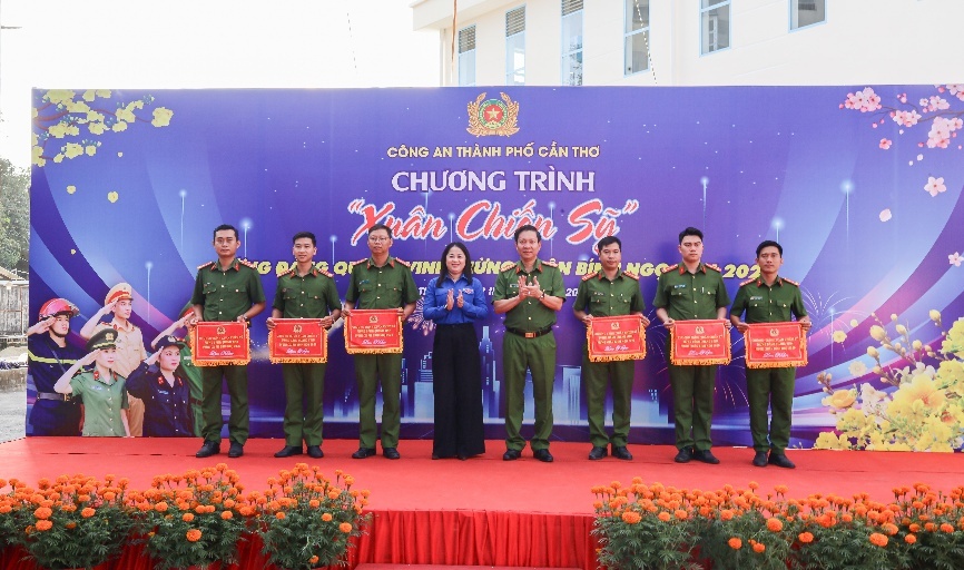 Đồng chí Lư Thị Ngọc Anh, Ủy viên Ban Thường vụ Trung ương Đoàn, Thành ủy viên, Phó Chủ tịch Ủy ban Mặt trận Tổ quốc Việt Nam thành phố, Bí thư Thành Đoàn và Đại tá Trần Hoàng Độ, Phó Giám đốc Công an thành phố trao cờ lưu niệm cho các đơn vị tham gia chương trình