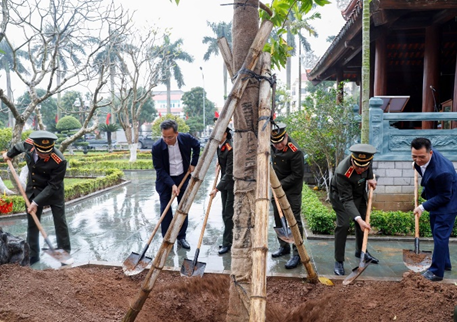 Bộ trưởng Lương Tam Quang cùng các đại biểu trồng cây lưu niệm tại khuôn viên Công an tỉnh Hưng Yên.