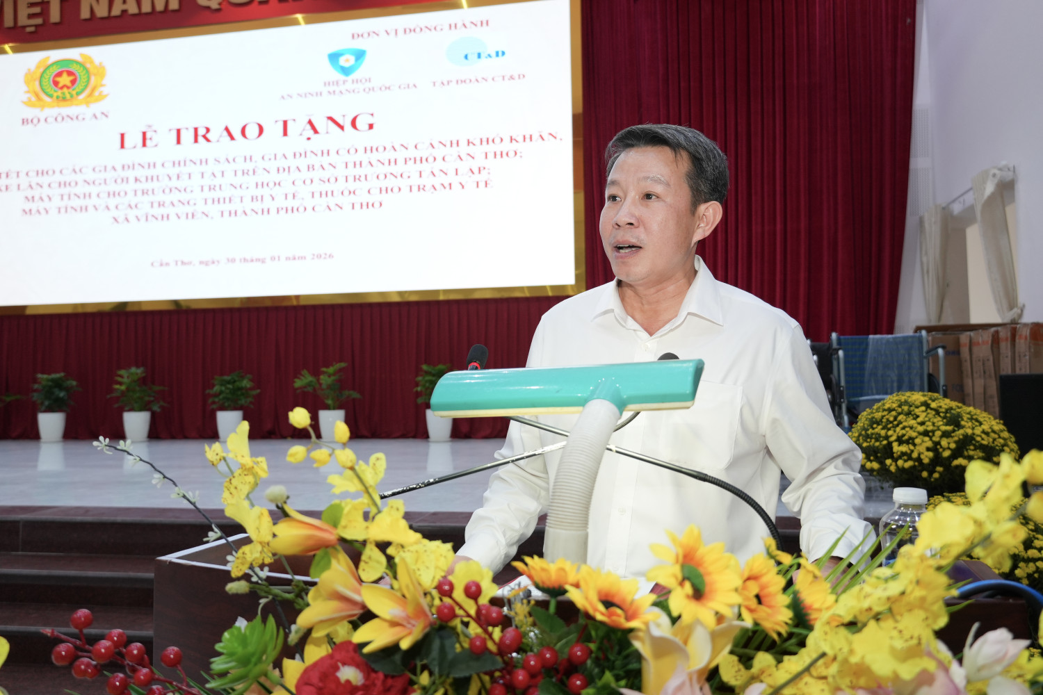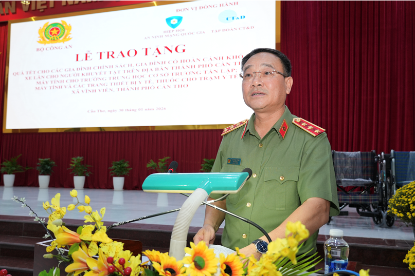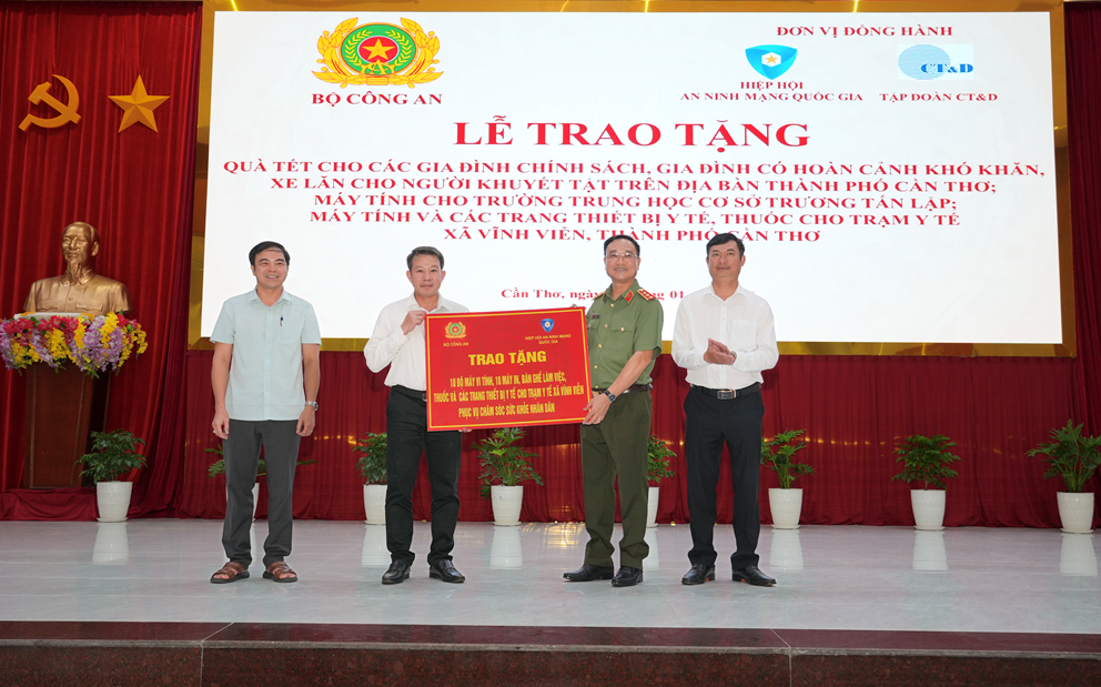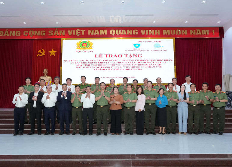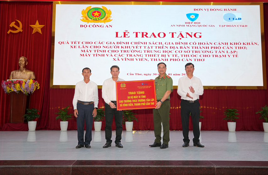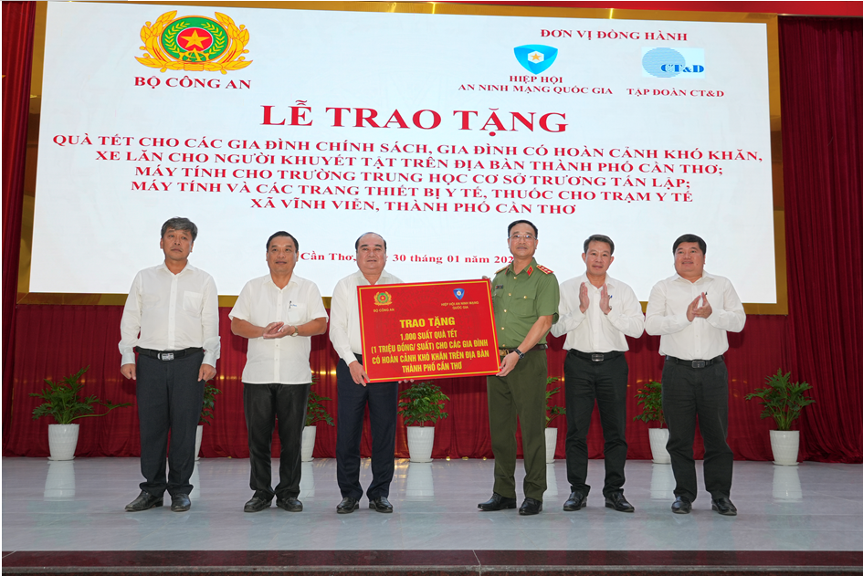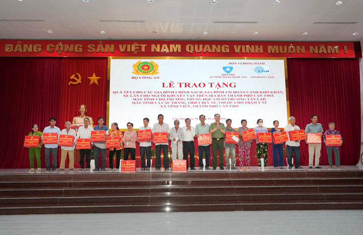 Chiều ngày 30/01/2026, tại xã Vĩnh Viễn, thành phố Cần Thơ, Bộ Công an phối hợp với Hiệp hội An ninh mạng Quốc gia, Công ty Cổ phần Công nghệ An ninh mạng Quốc gia Việt Nam (NCS) và Tập đoàn CT&D tổ chức Lễ trao tặng quà Tết cho các gia đình chính sách, gia đình có hoàn cảnh khó khăn, xe lăn cho người khuyết tật trên địa bàn.