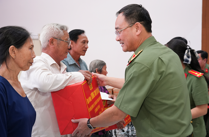 Đồng chí Thượng tướng Phạm Thế Tùng, Ủy viên Ban Chấp hành Trung ương Đảng, Thứ trưởng Bộ Công an đại diện Đoàn Công tác trao tặng 20 phần quà Tết do đồng chí Đại tướng Lương Tam Quang, Ủy viên Bộ Chính trị, Bí thư Đảng ủy Công an trung ương, Bộ trưởng Bộ Công an tặng các mẹ Việt Nam Anh hùng, gia đình chính sách, người có công cách mạng