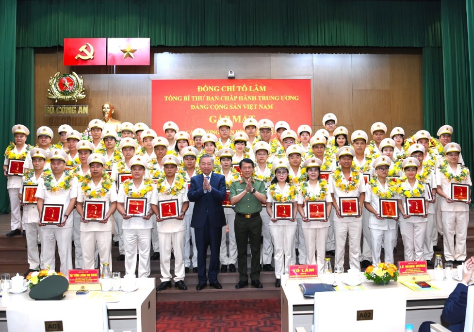 Tổng Bí thư Tô Lâm với các điển hình tiên tiến trong Công an nhân dân và lực lượng bảo vệ an ninh trật tự ở cơ sở.