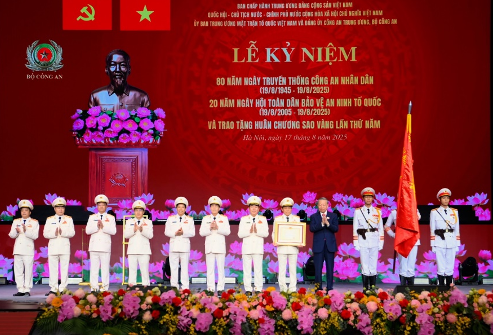 Tổng Bí thư Tô Lâm trao Huân chương Sao Vàng lần thứ năm tặng lực lượng Công an nhân dân Việt Nam.