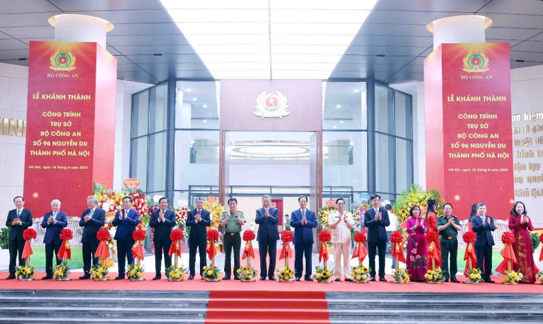 Tổng Bí thư Tô Lâm, Bộ trưởng Lương Tam Quang và các đại biểu thực hiện nghi thức cắt băng khánh thành Trụ sở Bộ Công an, số 96 Nguyễn Du, phường Cửa Nam, thành phố Hà Nội.