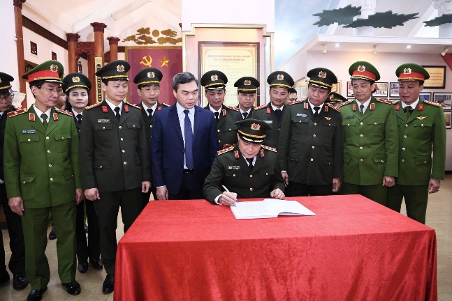 Thứ trưởng Lê Quốc Hùng ghi sổ cảm tưởng tại Khu Di tích lịch sử Nha Công an Trung ương.