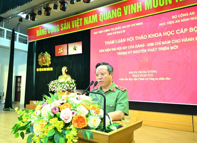 Trung tướng, PGS.TS Phan Xuân Tuy, Giám đốc Học viện Chính trị CAND cũng nhấn mạnh Văn kiện Đại hội XIV của Đảng là “kim chỉ nam” cho hành động trong kỷ nguyên mới bởi nó hội tụ các yếu tố: Đúng về lý luận, thực tiễn; rõ về phương hướng, đồng bộ về giải pháp và hiệu quả trong tổ chức thực hiện. Đây cũng là cơ sở để toàn Đảng, toàn dân, toàn quân ta thống nhất ý chí và hành động thực hiện thắng lợi mục tiêu phát triển đất nước trong kỷ nguyên mới. Trung tướng Phan Xuân Tuy đề xuất cần tập trung chọn vấn đề đúng, trúng để làm nhanh, làm hiệu quả. Đồng thời, tăng cường ứng dụng khoa học công nghệ để đổi mới nội dung, phương pháp tuyên truyền theo hướng xây dựng hệ thống cơ sở dữ liệu số để lan tỏa mạnh mẽ nội dung của Văn kiện Đại hội lần thứ XIV Đảng đến mọi người dân…