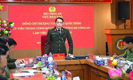 Báo cáo với đồng chí Thứ trưởng về các mặt công tác của đơn vị thời gian qua, Trung tướng Trần Minh Lệ, Cục trưởng Cục Đào tạo nêu rõ: Từ đầu năm 2026 đến nay, Cục Đào tạo đã ban hành và tập trung triển khai thực hiện Nghị quyết, Chương trình công tác năm của đơn vị, bước đầu đạt kết quả tốt. Nổi bật đã kịp thời tham mưu Đảng ủy Công an Trung ương, lãnh đạo Bộ ban hành, chỉ đạo triển khai các kế hoạch thực hiện chủ trương, chính sách của Đảng, Nhà nước về đột phá phát triển giáo dục và đào tạo trong Công an nhân dân (CAND).