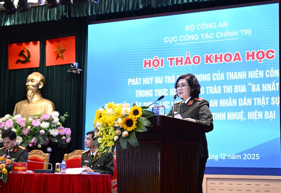 Ngày 10/12/2025, Cục Công tác chính trị tổ chức Hội thảo khoa học với chủ đề: “Phát huy vai trò tiên phong của thanh niên Công an nhân dân (CAND) trong thực hiện phong trào thi đua “Ba nhất: Kỷ luật nhất - Trung thành nhất - Gần dân nhất, góp phần xây dựng lực lượng CAND thật sự trong sạch, vững mạnh, chính quy, tinh nhuệ, hiện đại”. Thiếu tướng Ngô Hoài Thu, Phó Cục trưởng Cục Công tác chính trị chủ trì hội thảo. Cùng dự hội thảo có chuyên gia, nhà khoa học trong và ngoài lực lượng CAND cùng đông đảo đoàn viên, thanh niên trong CAND…
