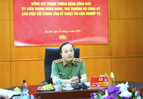 Ngày 16/4/2026, tại Hà Nội, Trung tướng Đặng Hồng Đức, Ủy viên Trung ương Đảng, Thứ trưởng Bộ Công an chủ trì buổi làm việc với Trung tâm Kỹ thuật tài liệu nghiệp vụ Bộ Công an về tổng thể các mặt công tác, hoạt động sản xuất kinh doanh và định hướng phát triển trong thời gian tới.