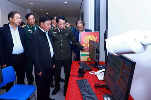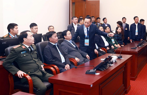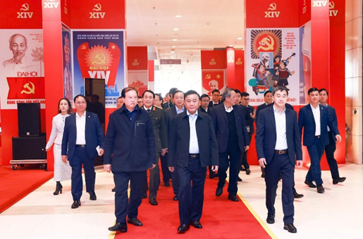 Thường trực Ban Bí thư Trần Cẩm Tú, Thứ trưởng Lê Quốc Hùng và các đại biểu kiểm tra các thiết bị an ninh phục vụ Đại hội XIV.