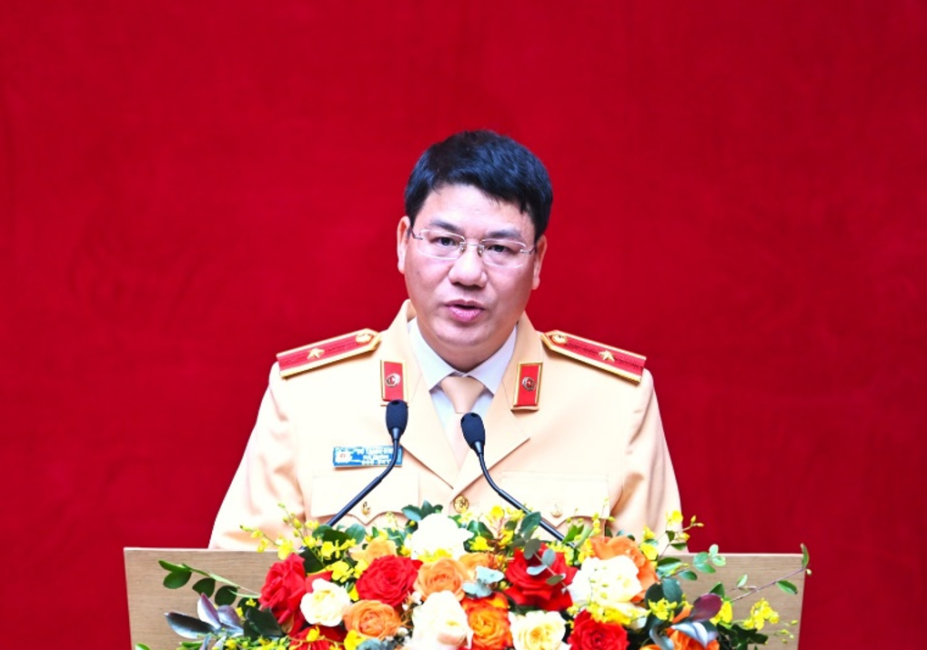 Thiếu tướng Đỗ Thanh Bình, Cục trưởng Cục CSGT trình bày báo cáo tóm tắt nội dung 03 Đề án trọng tâm trong lĩnh vực bảo đảm TTATGT.