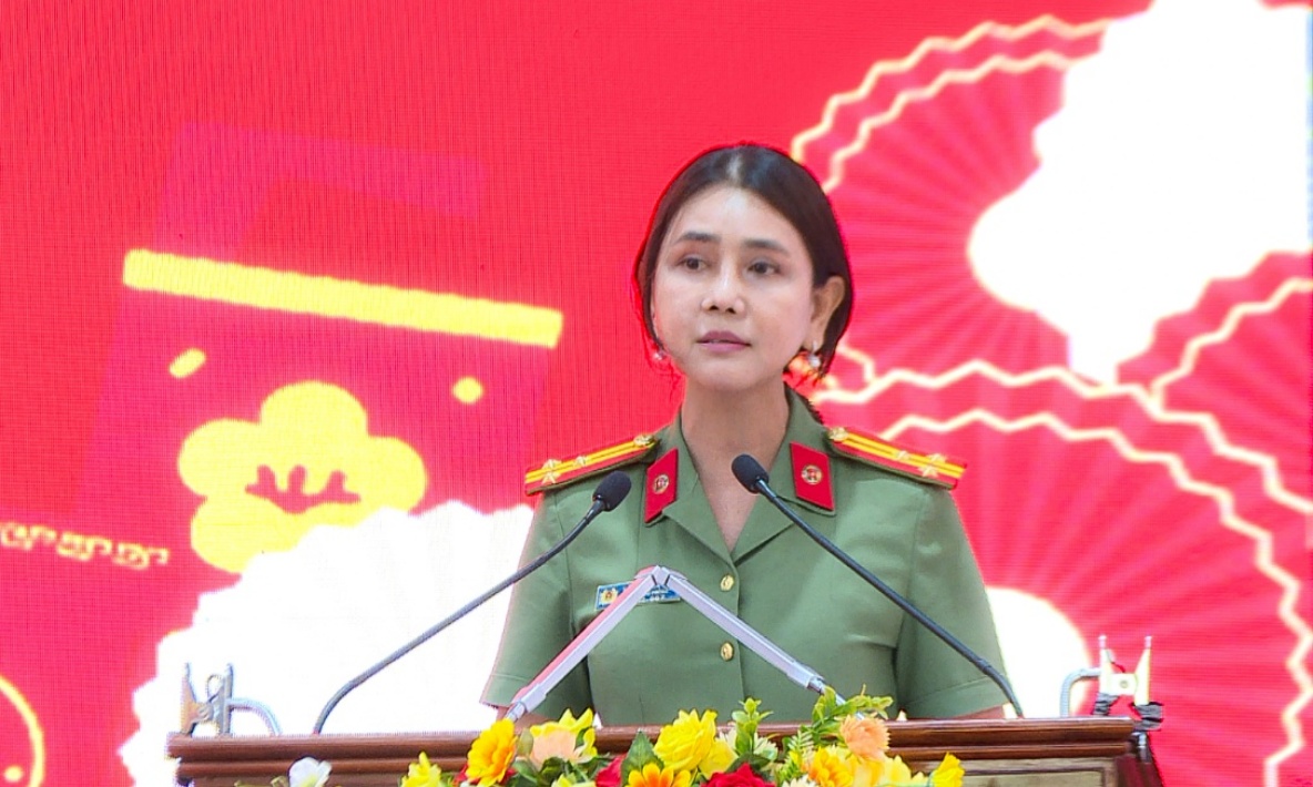 Thượng tá Võ Thị Hồng Tiến, Trưởng phòng Công tác chính trị phát biểu chúc Tết tại chương trình