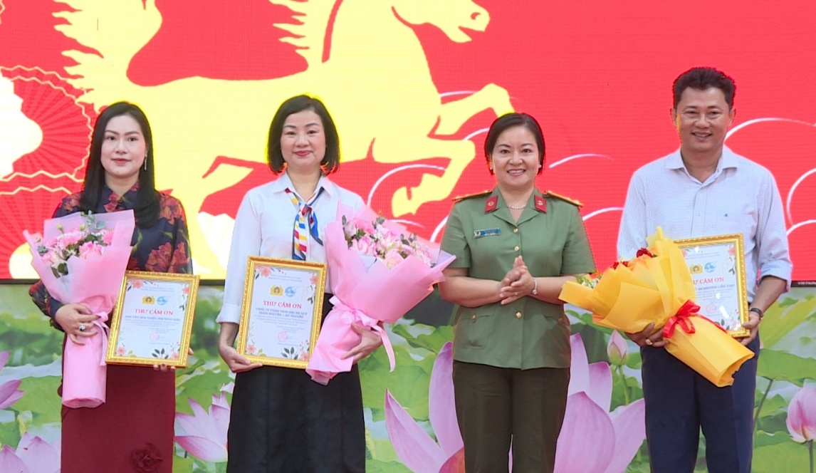 Thượng tá Huỳnh Thị Lê, Trưởng Ban Phụ nữ Công an thành phố trao thư cảm ơn và tặng hoa cho các đơn vị đồng hành