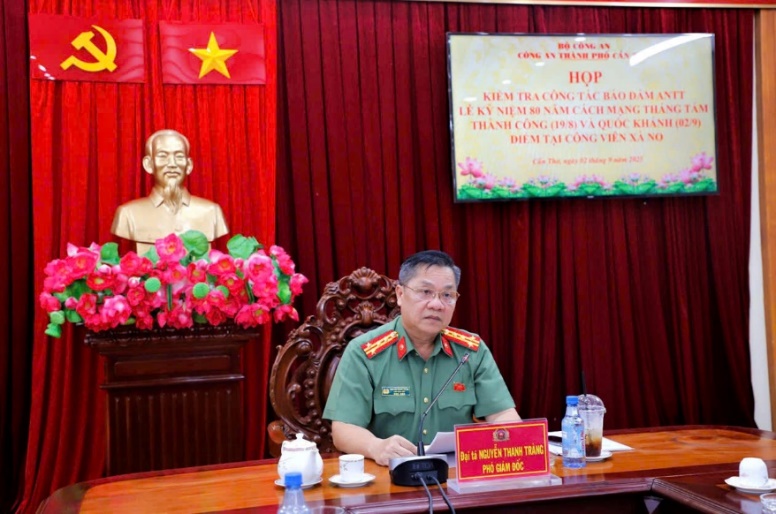Đại tá Nguyễn Thanh Tràng, Phó Bí thư Đảng ủy, Phó Giám đốc Công an thành phố phát biểu chỉ đạo tại cuộc họp kiểm tra công tác bảo đảm an ninh, trật tự Lễ Kỷ niệm 80 năm Cách mạng Tháng Tám và Quốc khánh 02/9