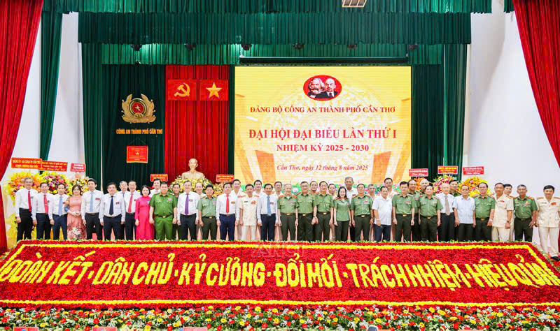 Lãnh đạo Công an thành phố và các đại biểu chụp ảnh lưu niệm tại Đại hội Đảng bộ Công an thành phố Cần Thơ lần thứ I, nhiệm kỳ 2025 - 2030
