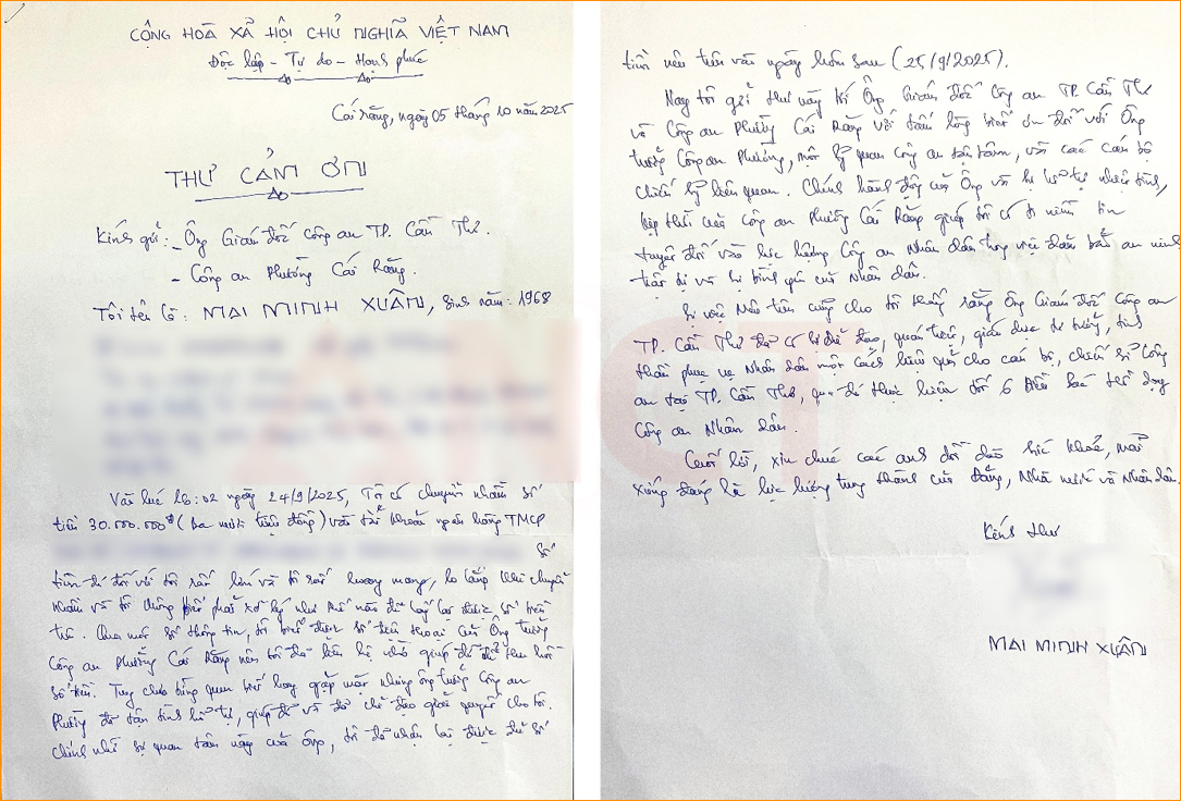 Ông Mai Minh Xuân (cư trú tại khu vực 5, phường Cái Răng) chia sẻ sự việc chuyển nhầm 30 triệu đồng vào tài khoản của người lạ. Trong lúc bối rối, ông đã tìm đến sự hỗ trợ của Công an phường. Chỉ sau một ngày, với sự hướng dẫn và hỗ trợ tận tình, ông đã nhận lại được toàn bộ s ố tiền. Trong thư, ông bày tỏ “niềm tin tuyệt đối vào lực lượng Công an nhân dân” và xúc động trước tinh thần trách nhiệm, tận tâm phục vụ Nhân dân của cán bộ, chiến sĩ.
