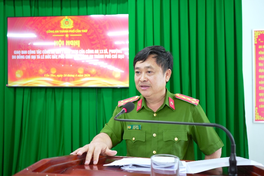 Ngày 24/4/2026, Công an thành phố tổ chức Hội nghị giao ban Công an 13 xã, phường nhằm đánh giá kết quả công tác bảo đảm an ninh, trật tự (ANTT) quý I/2026 và triển khai nhiệm vụ trọng tâm thời gian tới. Đại tá Lê Đức Bảy, Phó Giám đốc Công an thành phố chủ trì hội nghị. Tham dự Hội nghị có lãnh đạo các phòng nghiệp vụ, lãnh đạo phụ trách địa bàn và Trưởng Công an 13 xã, phường. Báo cáo tại Hội nghị cho thấy, trong quý I/2026, Công an các xã, phường đã thực hiện tốt vai trò tham mưu với cấp ủy, chính quyền địa phương, huy động sức mạnh tổng hợp của cả hệ thống chính trị trong công tác bảo đảm ANTT. Tình hình an ninh chính trị trên địa bàn tiếp tục được giữ vững ổn định, không để xảy ra các vụ việc phức tạp, đột xuất, bất ngờ. Công tác đấu tranh phòng, chống tội phạm được triển khai quyết liệt; nhiều vụ việc về ma túy, kinh tế, môi trường và tệ nạn xã hội đã bị phát hiện, xử lý kịp thời. Nhìn chung, các chỉ tiêu công tác năm 2026 của lực lượng Công an cấp xã cơ bản bám sát tiến độ đề ra.