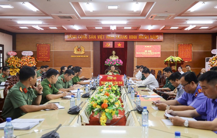 Đồng chí Đại tá Bùi Đức An - Phó Giám đốc dự chủ trì Hội nghị tại điểm cầu Công an thành phố Cần Thơ