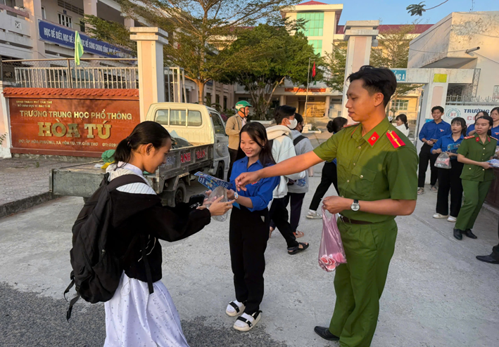 Tiếp nối tinh thần đó, sáng ngày 27/3/2026, Chi đoàn Công an xã Hòa Tú tiếp tục phối hợp tổ chức phát 100 phần bánh mì và nước suối cùng tài liệu tuyên truyền cho các em học sinh Trường THPT Hòa Tú (thuộc ấp Hòa Phuông, xã Hòa Tú). Những phần quà tuy nhỏ nhưng thể hiện sự quan tâm sâu sắc của lực lượng Công an và tuổi trẻ địa phương đối với việc chăm lo, động viên các em nỗ lực vươn lên trong học tập và rèn luyện.