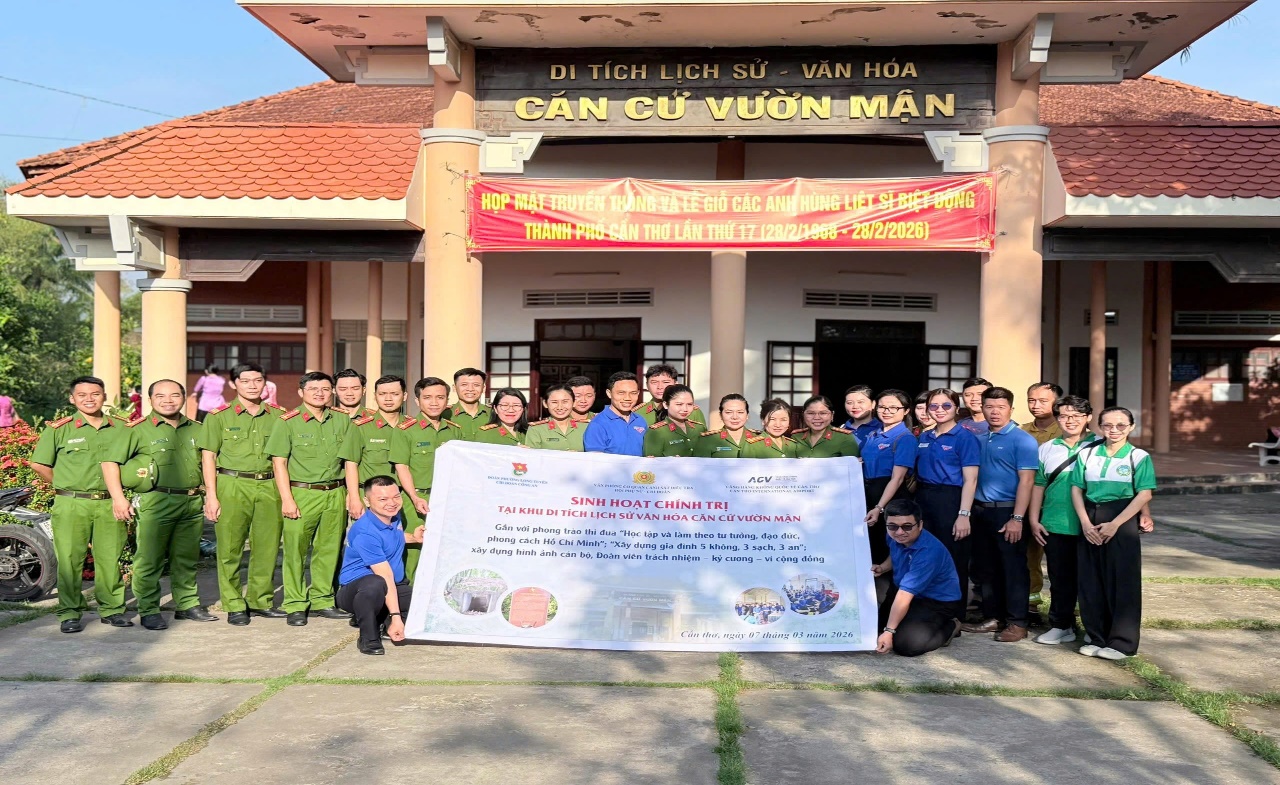 Bên cạnh đó, các đoàn thể của đơn vị phối hợp cùng Chi đoàn Công an phường Long Tuyền và Đoàn Thanh niên Cảng hàng không quốc tế Cần Thơ tổ chức hoạt động sinh hoạt chính trị tại Khu di tích lịch sử văn hóa Căn cứ Vườn Mận (phường Long Tuyền, thành phố Cần Thơ). Tại đây, cán bộ, đoàn viên, hội viên đã dâng hương tưởng niệm, ôn lại truyền thống cách mạng của địa phương gắn với tấm gương Mẹ Việt Nam Anh hùng Tạ Thị Phi; đồng thời tham gia hưởng ứng phong trào “Tết trồng cây, đời đời nhớ ơn Bác Hồ”, trồng cây xanh và ra quân dọn dẹp vệ sinh, chăm sóc, bảo tồn cảnh quan khu di tích.