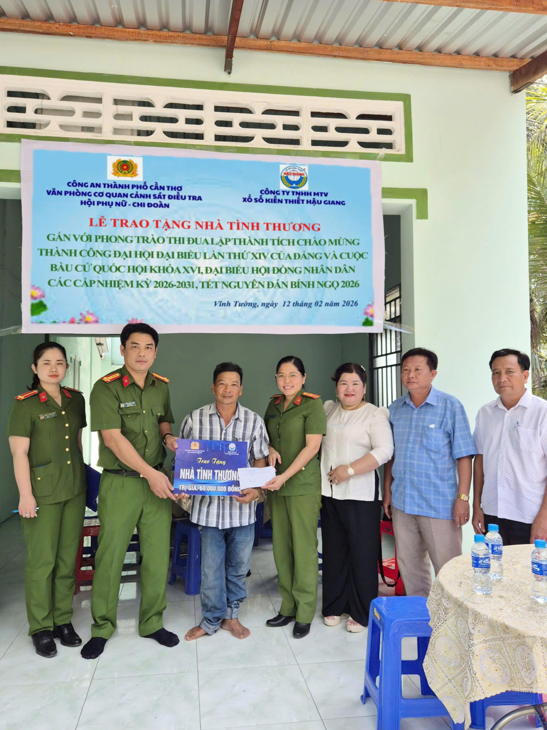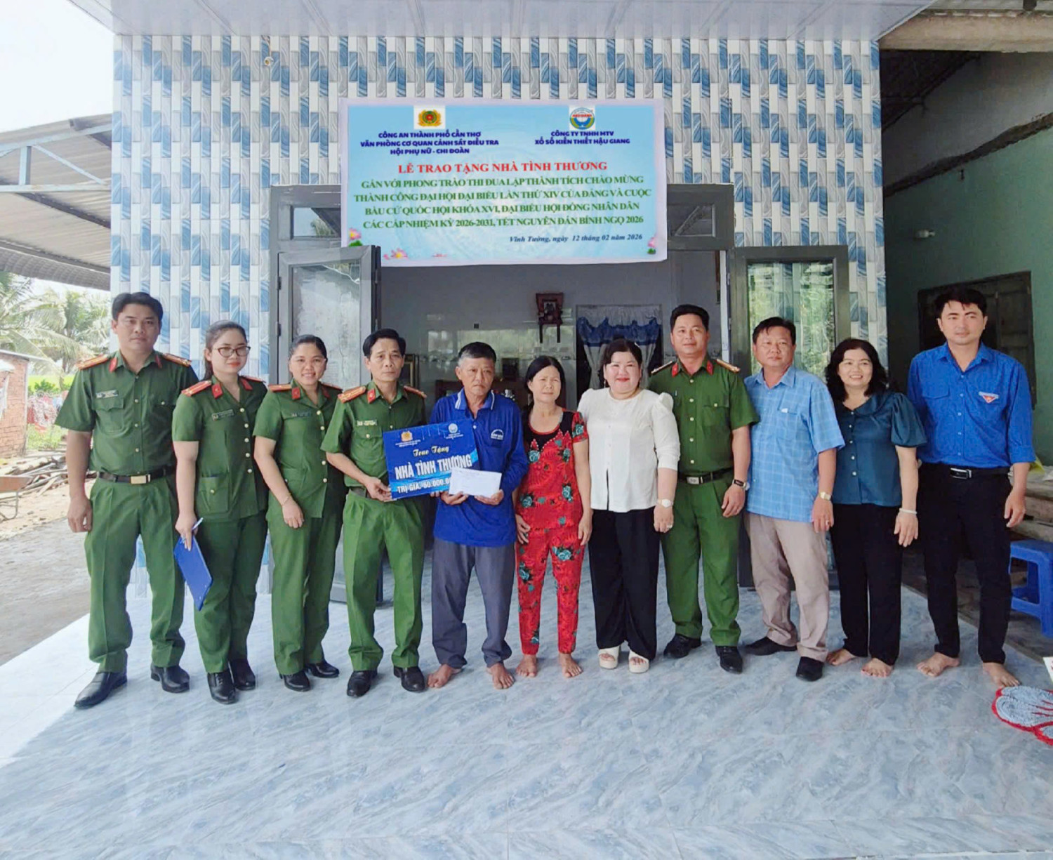 Thiết thực chào mừng thành công Đại hội đại biểu toàn quốc lần thứ XIV của Đảng và cuộc bầu cử Quốc hội khóa XVI, đại biểu Hội đồng nhân dân các cấp nhiệm kỳ 2026 - 2031, Tết Nguyên đán Bính Ngọ 2026 và phát huy tinh thần tương thân, tương ái, sẻ chia cùng cộng đồng, Hội Phụ nữ, Chi đoàn Văn phòng Cơ quan Cảnh sát điều tra, Công an thành phố Cần Thơ đã vận động Công ty TNHH MTV Xổ số kiến thiết Hậu Giang hỗ trợ kinh phí xây dựng 02 căn nhà tình thương cho hộ nghèo trên địa bàn xã Vĩnh Tường, thành phố Cần Thơ.