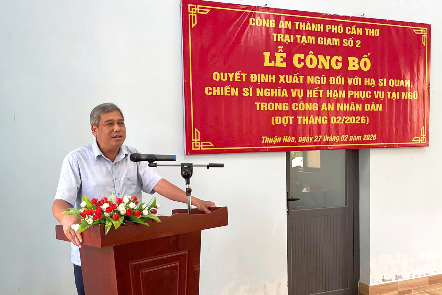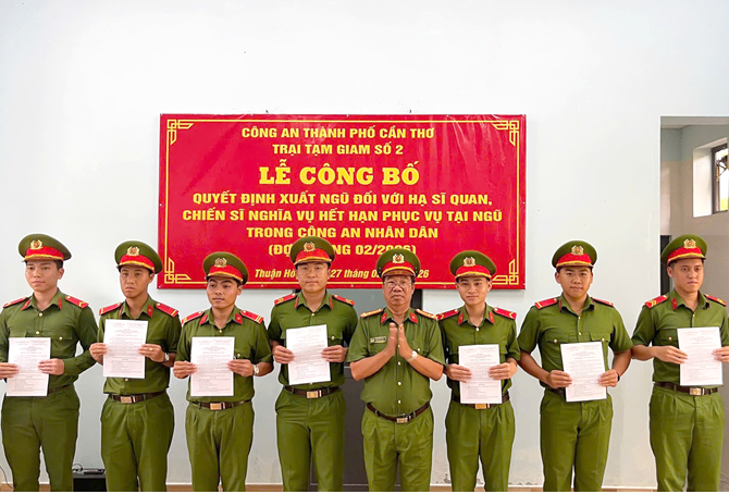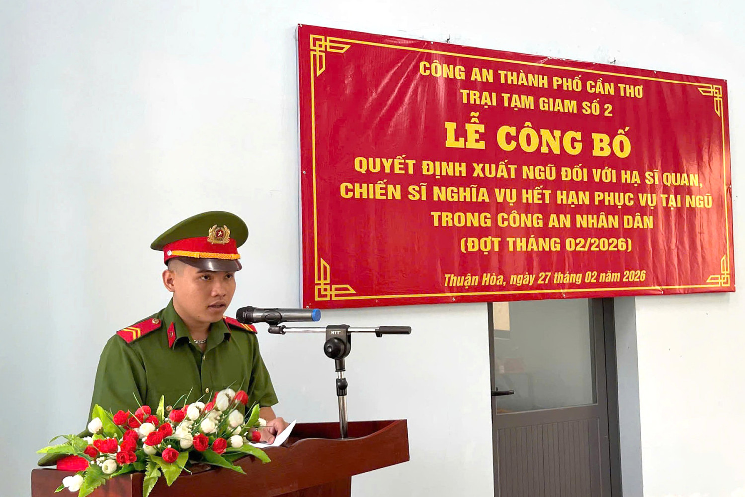Thực hiện Quyết định của Giám đốc Công an thành phố Cần Thơ, chiều ngày 27/02, Trại tạm giam số 2, Công an thành phố đã tổ chức Lễ công bố Quyết định chuyển sang chế độ phục vụ chuyên nghiệp và Quyết định xuất ngũ đối với chiến sĩ nghĩa vụ hết hạn phục vụ tại ngũ trong Công an nhân dân.