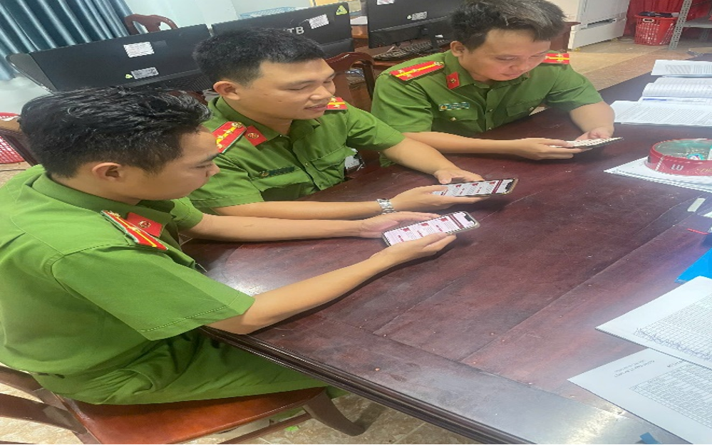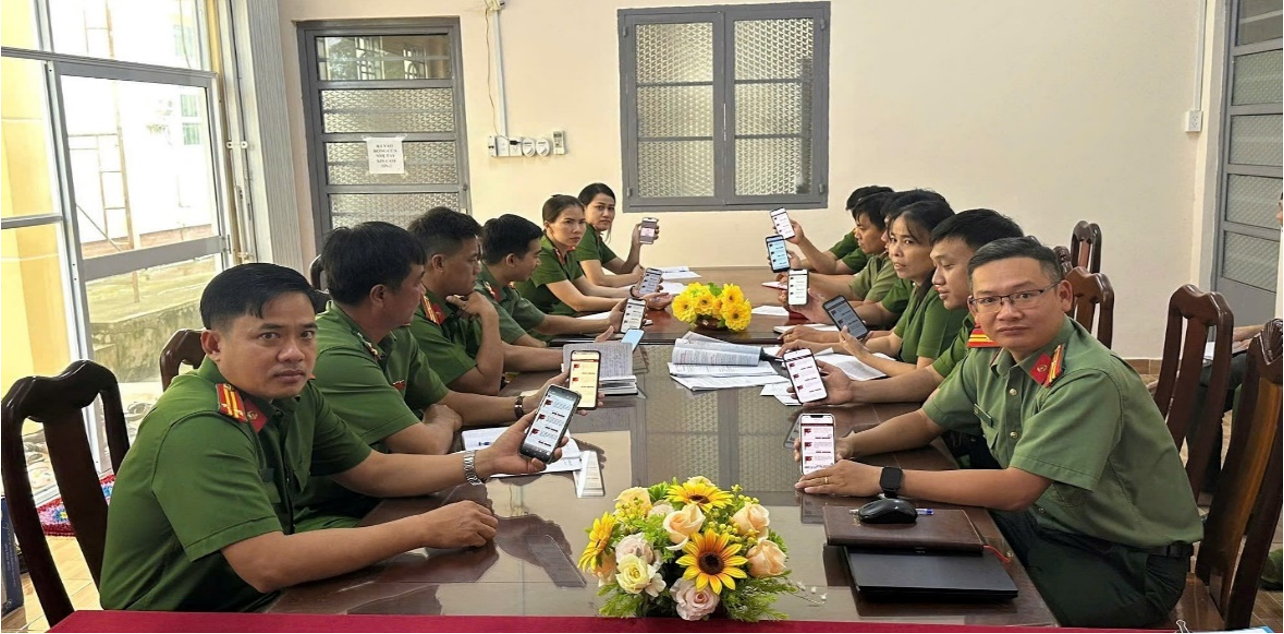 Cán bộ, chiến sĩ Công an xã Hòa Tú tham gia góp ý văn kiện trên ứng dụng VNeID