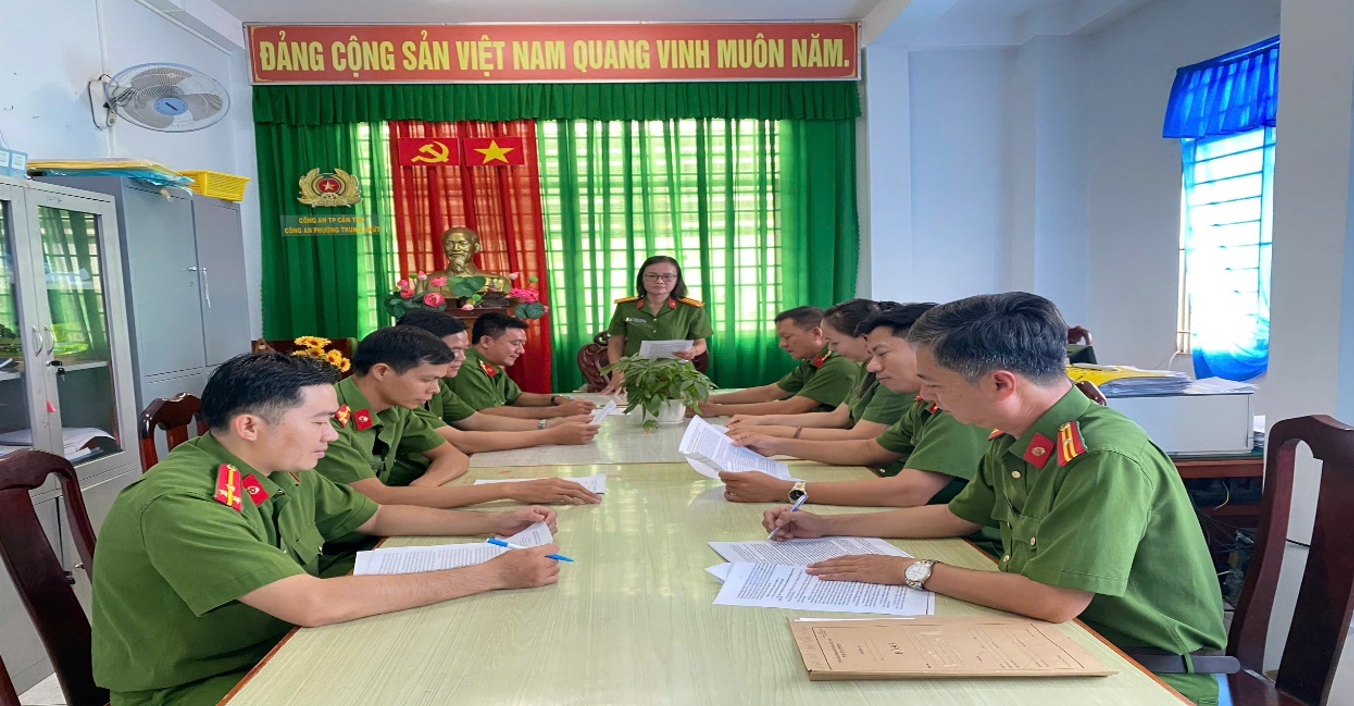 Trung tá Trần Thị Hương, Phó Trưởng Công an phường Trung Nhứt triển khai đến cán bộ, chiến sĩ lấy ý kiến đối với các văn kiện trình Đại hội đại biểu toàn quốc lần thứ XIV của Đảng.