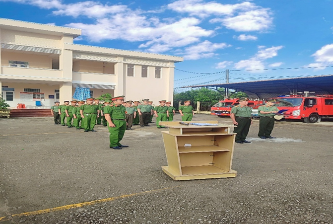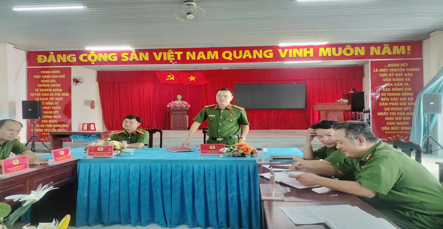 Đồng chí Thiếu tá Đặng Hoài Nhớ, Trưởng Công an xã Thạnh Hòa giải đáp các ý kiến của cán bộ, chiến sĩ