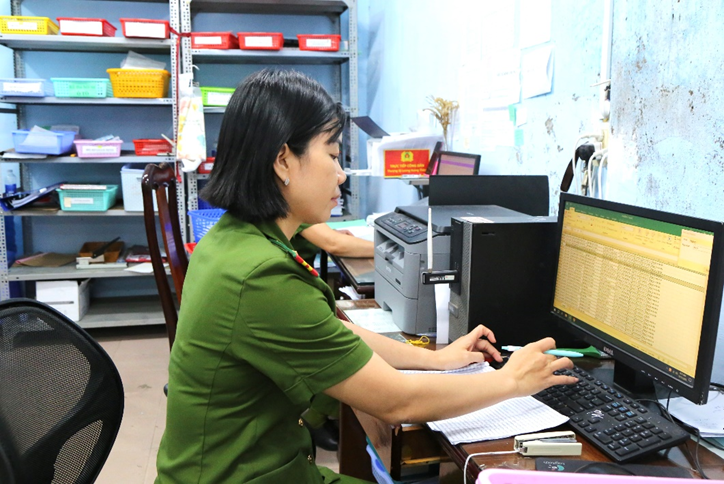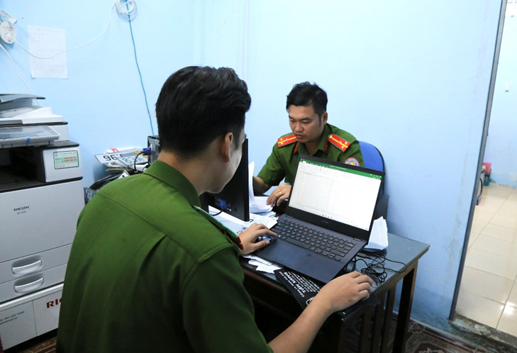 Cán bộ, chiến sĩ Công an phường Phú Lợi thực hiện rà soát thông tin và số hoá hồ sơ đăng ký phương tiện