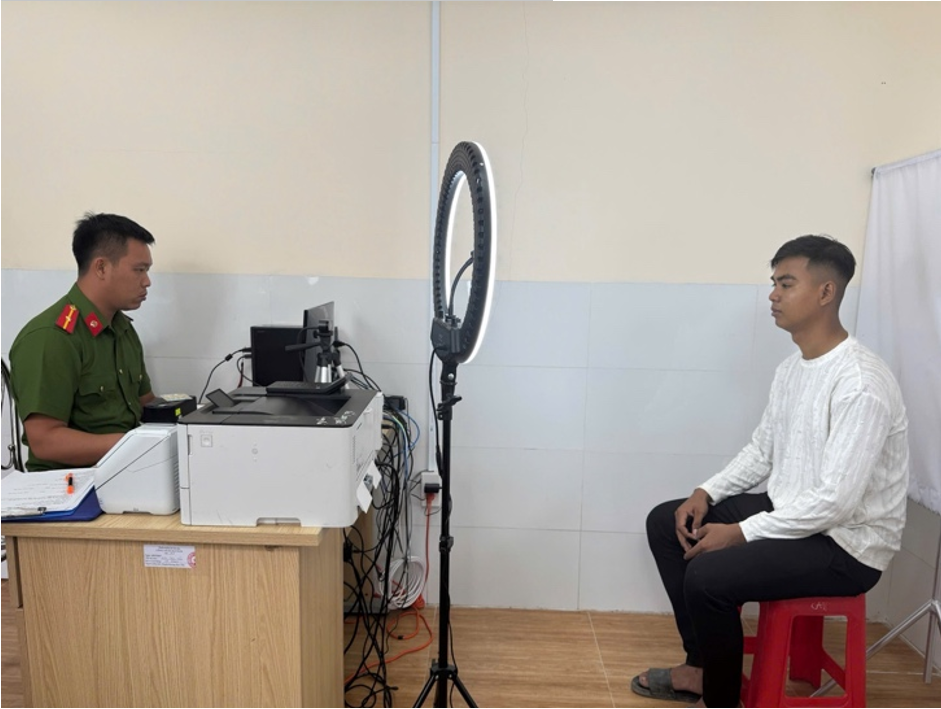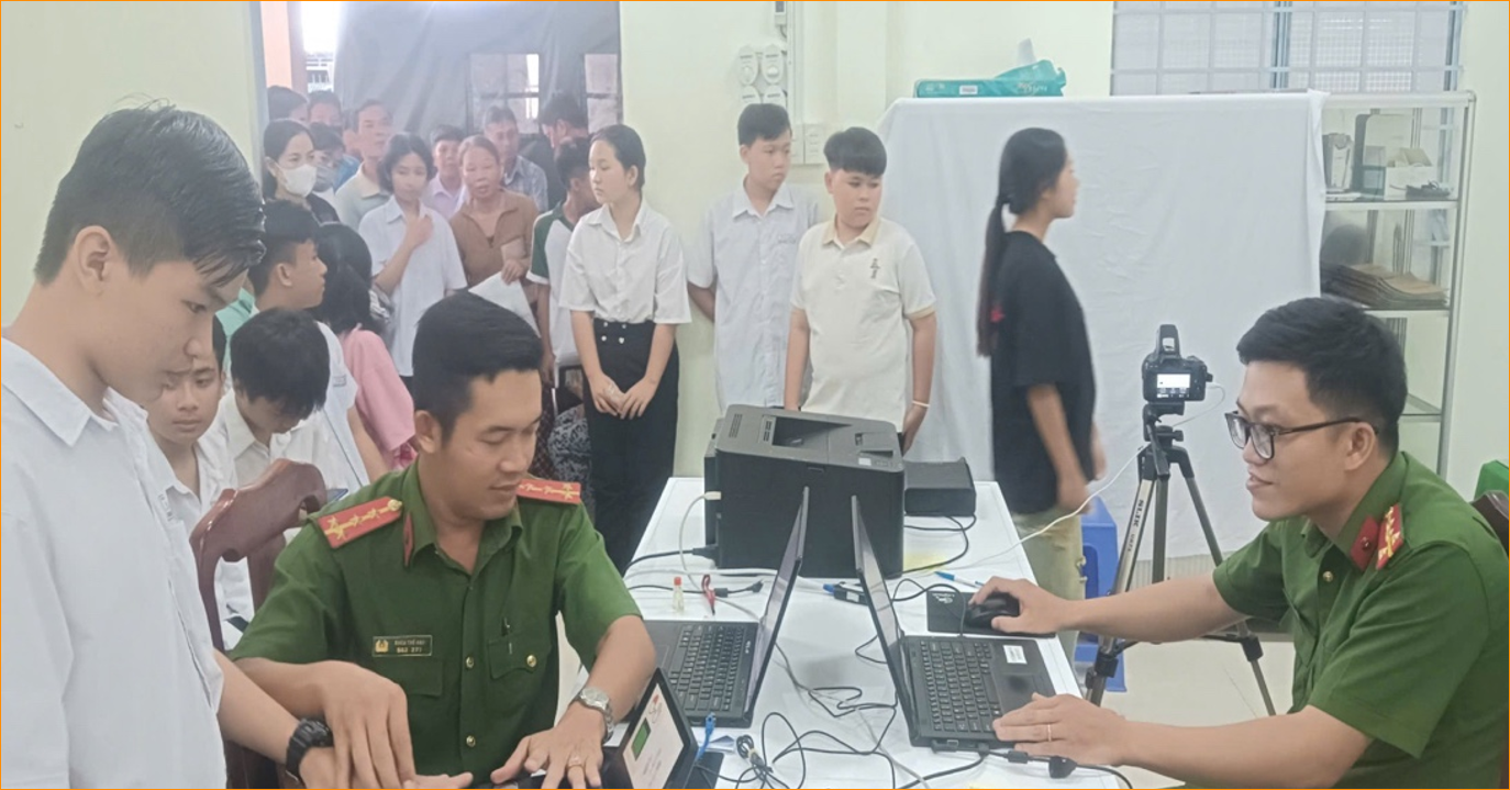 Cán bộ Công an xã Thạnh Hòa cấp căn cước và định danh điện tử cho các em học sinh