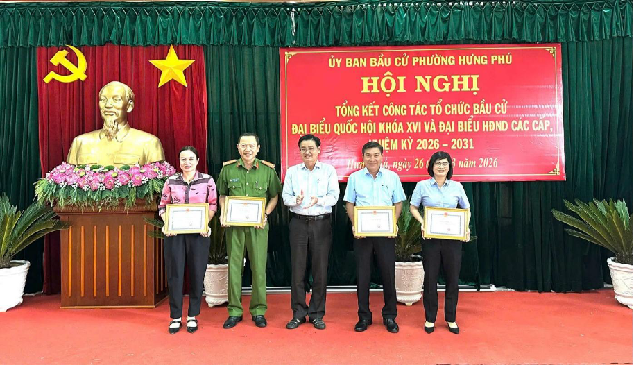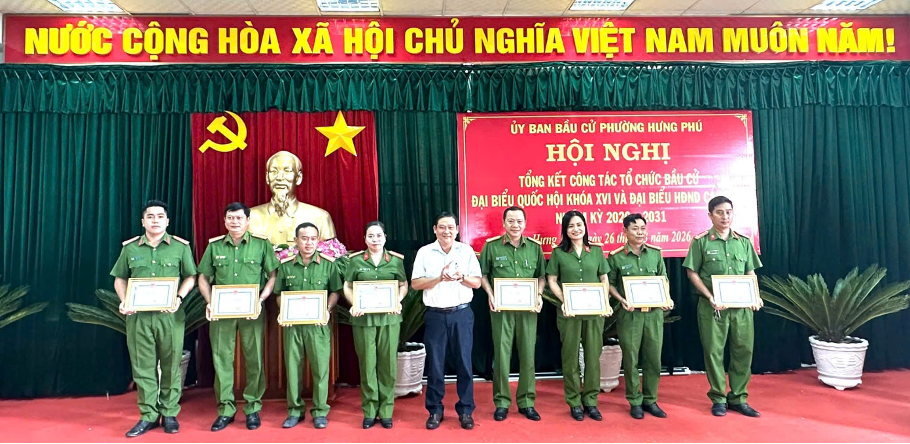 Với tinh thần chủ động, trách nhiệm, Công an phường Hưng Phú đã hoàn thành xuất sắc nhiệm vụ đảm bảo an ninh, an toàn cuộc bầu cử đại biểu Quốc hội khóa XVI và Hội đồng nhân dân các cấp nhiệm kỳ 2026-2031. Tập thể Công an phường vinh dự được Chủ tịch Ủy ban nhân dân phường Hưng Phú tặng giấy khen chotập thể và 12 cá nhân có thành tích xuất sắc trong công tác bầu cử đại biểu Quốc hội khóa XVI và đại biểu Hội đồng nhân dân các cấp nhiệm kỳ 2026-2031 nhân dịp Hội nghị Tổng kết Công tác tổ chức bầu cử vào ngày 26 tháng 3 năm 2026 tại Ủy ban nhân dân phường Hưng Phú.