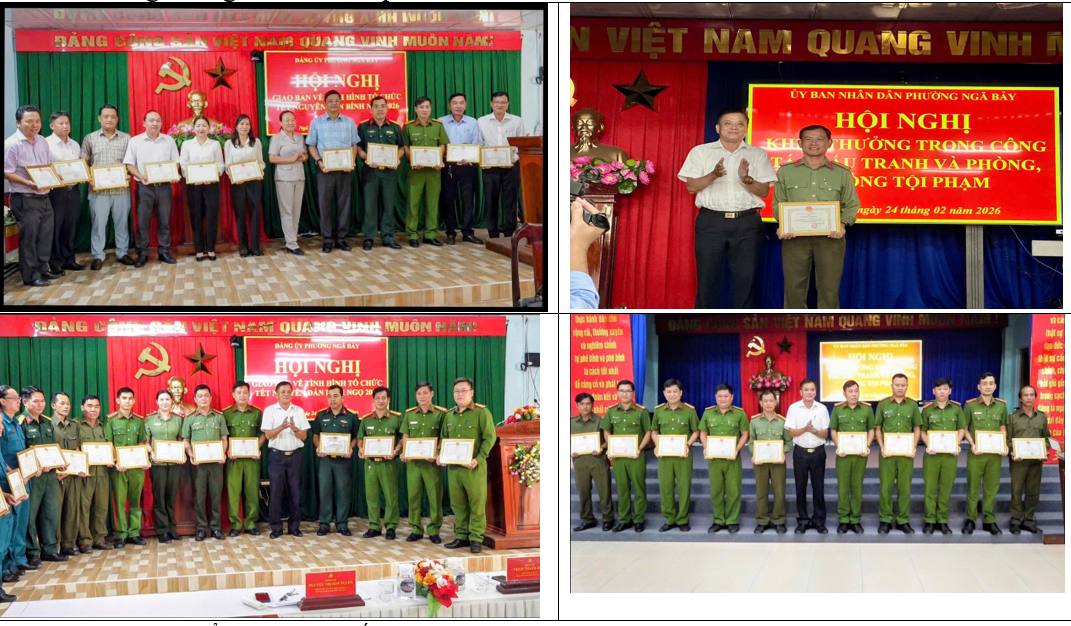 Ghi nhận những kết quả đạt được, ngày 24/02/2026, tại Hội nghị giao ban về tình hình tổ chức tết Nguyên đán Bính Ngọ năm 2026 và Hội nghị khen thưởng trong công tác đấu tranh phòng, chống tội phạm, Chủ tịch UBND phường Ngã Bảy đã trao 02 giấy khen đối với tập thể Công an phường Ngã Bảy và 19 cá nhân có thành tích tiêu biểu trong công tác bảo đảm an ninh, trật tự và tham gia các hoạt động mừng Đảng, mừng Xuân Bính Ngọ năm 2026. Trong thời gian tới, Công an phường Ngã Bảy tiếp tục phát huy vai trò nòng cốt trong công tác bảo đảm an ninh, trật tự ở cơ sở; chủ động nắm chặt tình hình, phòng ngừa từ sớm, từ xa; đấu tranh hiệu quả với các loại tội phạm, góp phần giữ vững ổn định chính trị, trật tự an toàn xã hội, phục vụ nhiệm vụ phát triển kinh tế - xã hội của địa phương./.