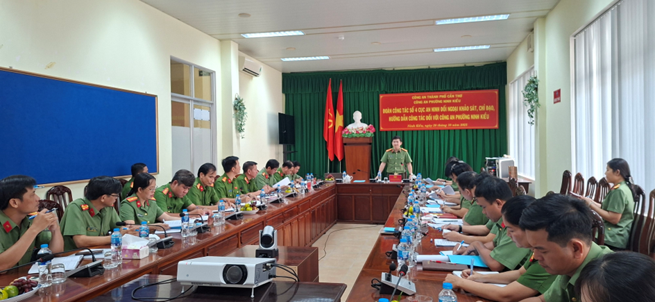 Thực hiện kế hoạch công tác của Bộ Công an về hướng dẫn, kiểm tra việc thực hiện nhiệm vụ an ninh đối ngoại tại công an cơ sở, đặc biệt sau khi điều chỉnh địa giới hành chính và triển khai mô hình Công an ba cấp, Đoàn công tác đã làm việc trực tiếp với Công an phường Ninh Kiều nhằm nắm bắt kết quả triển khai các chủ trương, chỉ đạo của Bộ, của Cục An ninh đối ngoại và của Công an thành phố trong công tác quản lý nhà nước về an ninh đối ngoại. Tại buổi làm việc, Công an phường Ninh Kiều đã báo cáo khái quát tình hình địa bàn, những kết quả nổi bật trong công tác bảo đảm an ninh chính trị, trật tự an toàn xã hội, đặc biệt trong quản lý người nước ngoài, tổ chức quốc tế, hoạt động tôn giáo, ngoại giao nhân dân và các hoạt động hợp tác đối ngoại tại địa phương.
