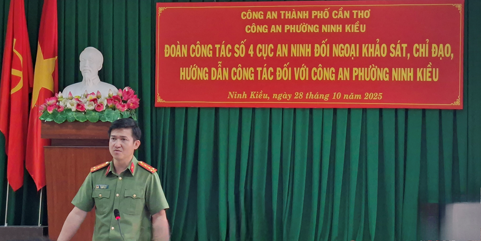 Ngày 28/10/2025, Đoàn công tác số 4 của Cục An ninh đối ngoại, Bộ Công an, do đồng chí Đại tá Mai Thế Quang, Phó Cục trưởng làm Trưởng đoàn đã đến khảo sát, chỉ đạo và hướng dẫn công tác tại Công an phường Ninh Kiều, thành phố Cần Thơ, cùng dự có lãnh đạo Phòng An ninh đối ngoại. Tiếp đón và làm việc với đoàn có đồng chí Thượng tá Phạm Hiền Tài, Trưởng Công an phường Ninh Kiều cùng Ban Chỉ huy và cán bộ, chiến sĩ đơn vị.