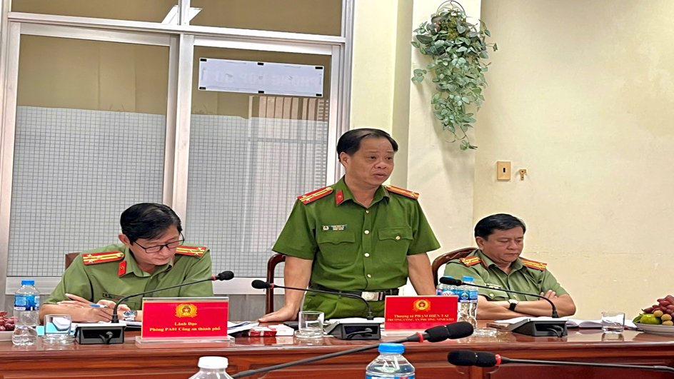 Thượng tá Nguyễn Thành Nhân, Trưởng Phòng An ninh đối ngoại, Công an thành phố phát biểu tại Hội nghị