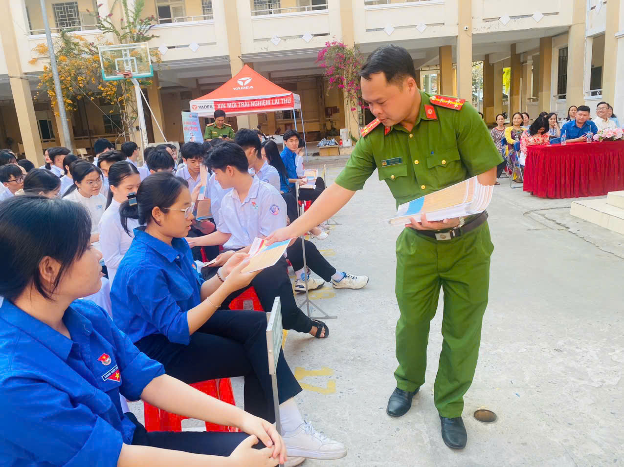 Cán bộ Công an phường phát tờ rơi tuyên truyền cho các em học sinh