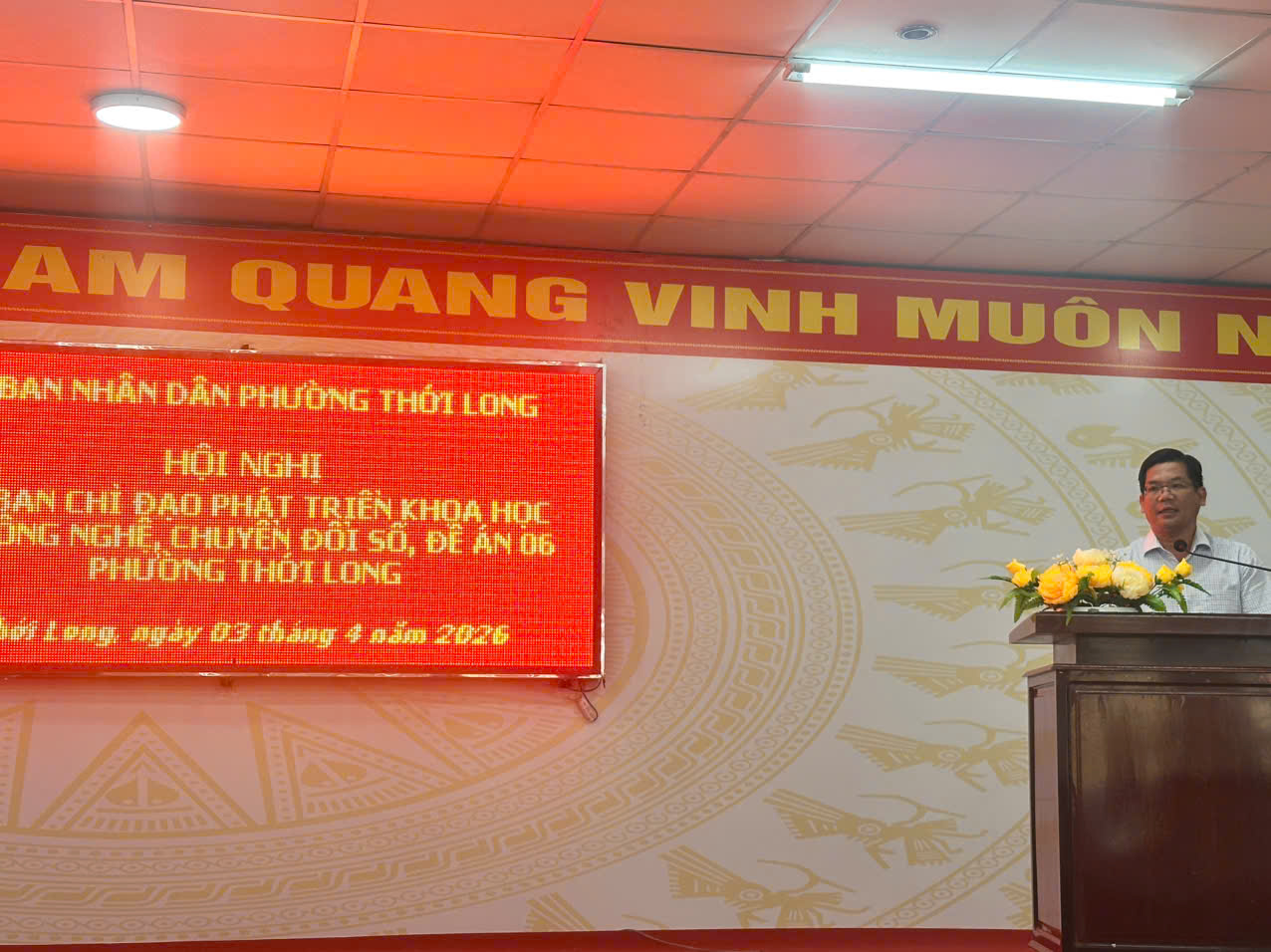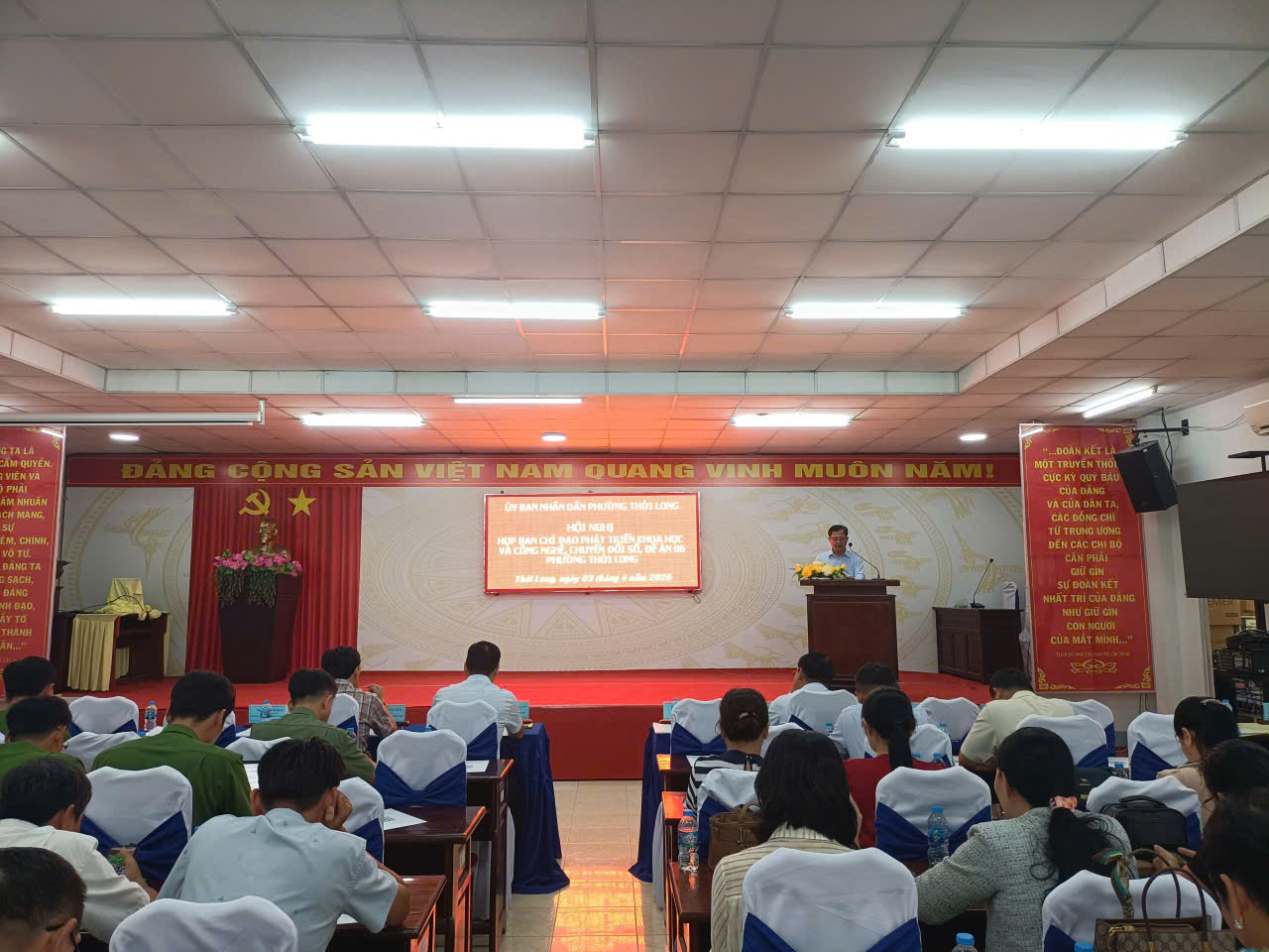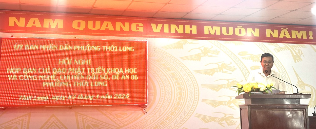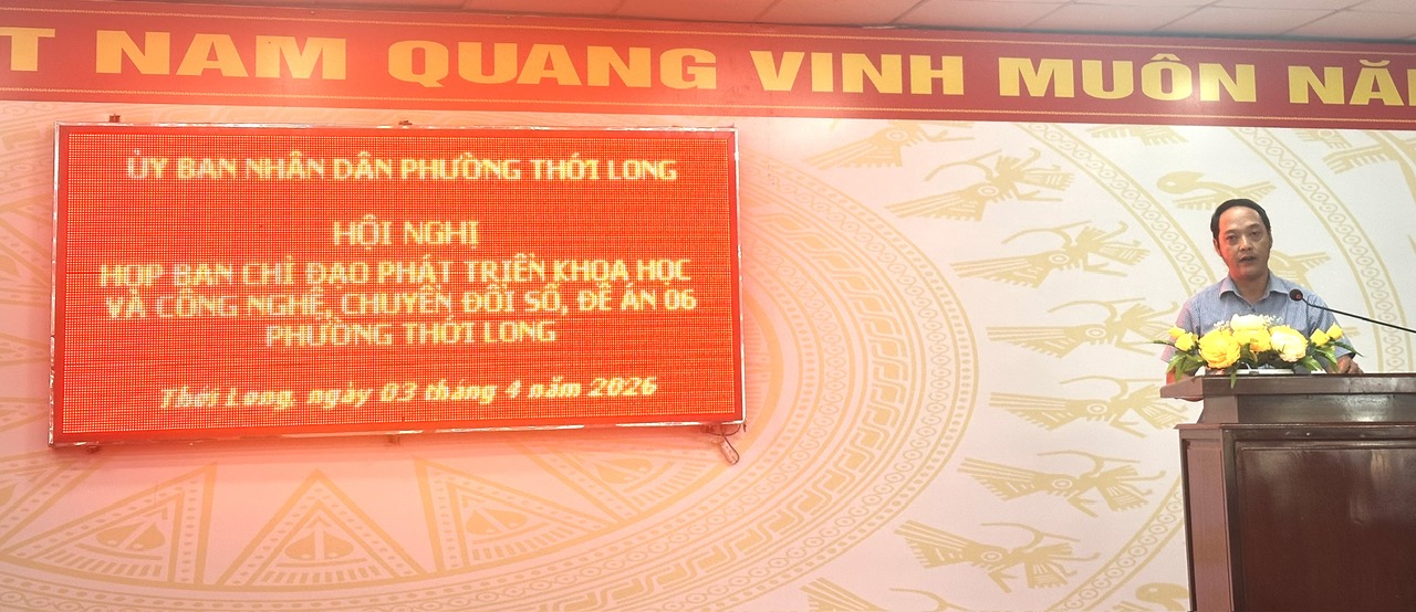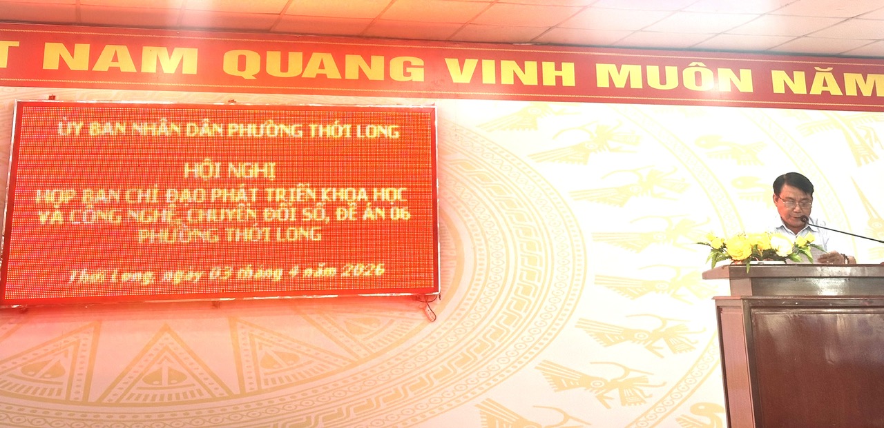 Sáng ngày 03/4/2026, tại trụ sở UBND phường Thới Long, Ban Chỉ đạo phát triển khoa học, công nghệ, đổi mới sáng tạo, chuyển đổi số và Đề án 06 phường Thới Long tổ chức Hội nghị đánh giá tình hình và triển khai nhiệm vụ trọng tâm năm 2026. Đồng chí Nguyễn Thanh Nhanh – Phó Bí thư Đảng ủy, Chủ tịch UBND phường, Trưởng Ban Chỉ đạo chủ trì Hội nghị. Tham dự có đồng chí Trần Văn Sang – UVBTV Đảng ủy, Trưởng Công an phường, Phó Trưởng ban, đồng chí Đặng Văn Tặng, Trưởng Phòng Văn hóa – Xã hội phường, cùng các đồng chí thành viên Ban Chỉ đạo, thành viên các Tiểu ban đề án của phường, cùng cán bộ, công chức, viên chức, đại diện Ban Giám hiệu các trường cùng các đồng chí Trưởng 22 khu vực trên địa bàn phường.