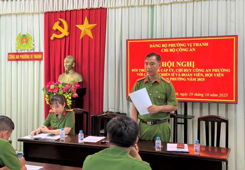 Ngày 29/10/2025, Chi ủy, Ban Chỉ huy Công an phường Vị Thanh tổ chức hội nghị đối thoại trực tiếp với cán bộ, chiến sĩ, đảng viên, đoàn viên và hội viên nhằm kịp thời nắm bắt tâm tư, nguyện vọng, tháo gỡ khó khăn, vướng mắc trong quá trình công tác và sinh hoạt. Đồng chí Thượng tá Lê Văn Quân, Ủy viên Ban Thường vụ Đảng ủy phường, Bí thư Chi bộ, Trưởng Công an phường chủ trì Hội nghị.