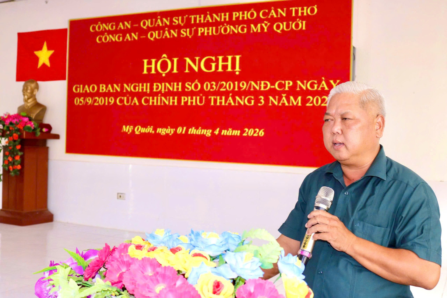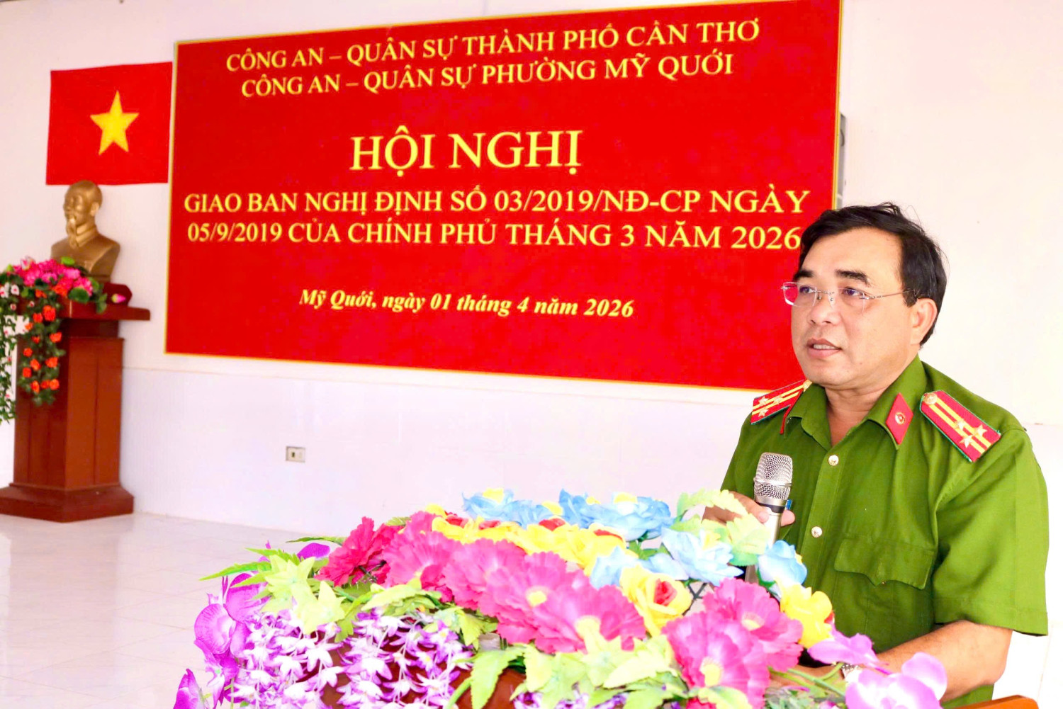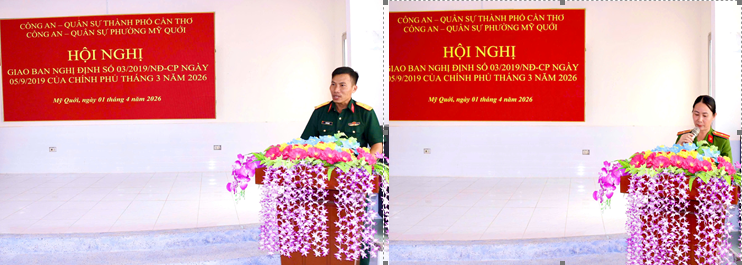 Ngày 01/4/2026, Công an - Quân sự phường Mỹ Quới tổ chức Hội nghị giao ban tháng 3 năm 2026 thực hiện Nghị định số 03/2029/NĐ-CP ngày 05/9/2019 của Chính phủ về phối hợp giữa Bộ Công an và Bộ Quốc phòng trong thực hiện nhiệm vụ bảo vệ an ninh quốc gia, bảo đảm trật tự, an toàn xã hội, đấu tranh phòng, chống tội phạm và nhiệm vụ quốc phòng. Dự và chỉ đạo Hội nghị có đồng chí Lê Văn Dũng, Phó Bí thư Đảng ủy, Chủ tịch Uỷ ban nhân dân phường; tham dự Hội nghị có Ban Chỉ huy, cán bộ, chiến sĩ Công an phường, Ban Chỉ huy Quân sự phường, lực lượng tham gia bảo vệ an ninh, trật tự ở cơ sở và trung đội dân quân thường trực cùng dự.