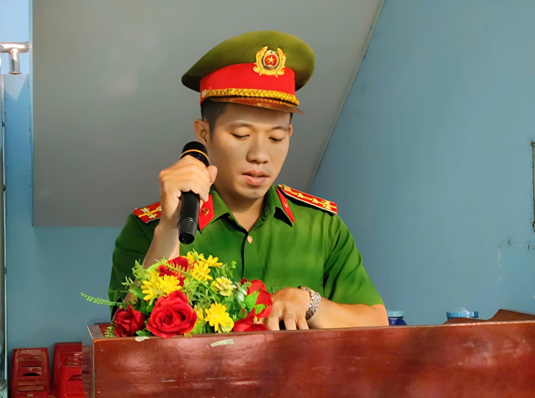 Thiếu tá Trần Hoàng Hôn, Phó Trưởng Công an xã Tân Bình tại buổi tập huấn nghiệp vụ phòng cháy, chữa cháy và cứu nạn, cứu hộ.