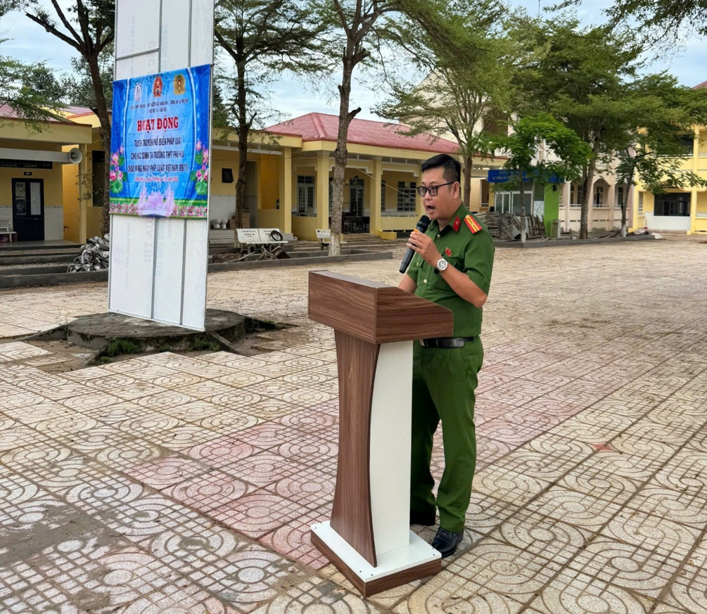 Cán bộ Công an xã Tân Long tuyên truyền kiến thức pháp luật đến với cán bộ, giáo viên, học sinh nhà trường.