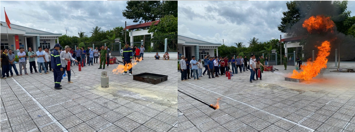 Người dân xã Tân Bình thực hành bình chữa cháy dập tắt đám cháy xăng dầu.