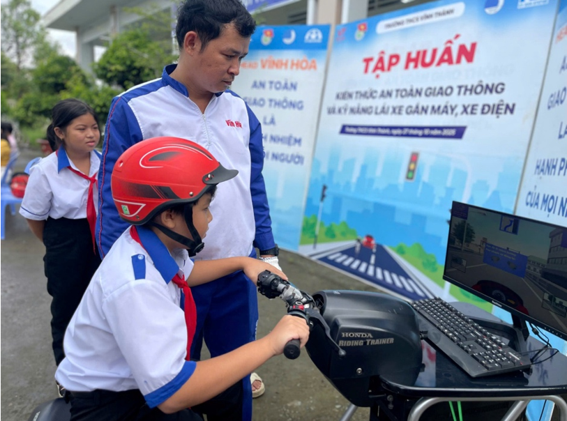 Học sinh Trường Trung học cơ sở Vĩnh Thành (xã Vĩnh Lợi) được hướng dẫn cách lái xe an toàn