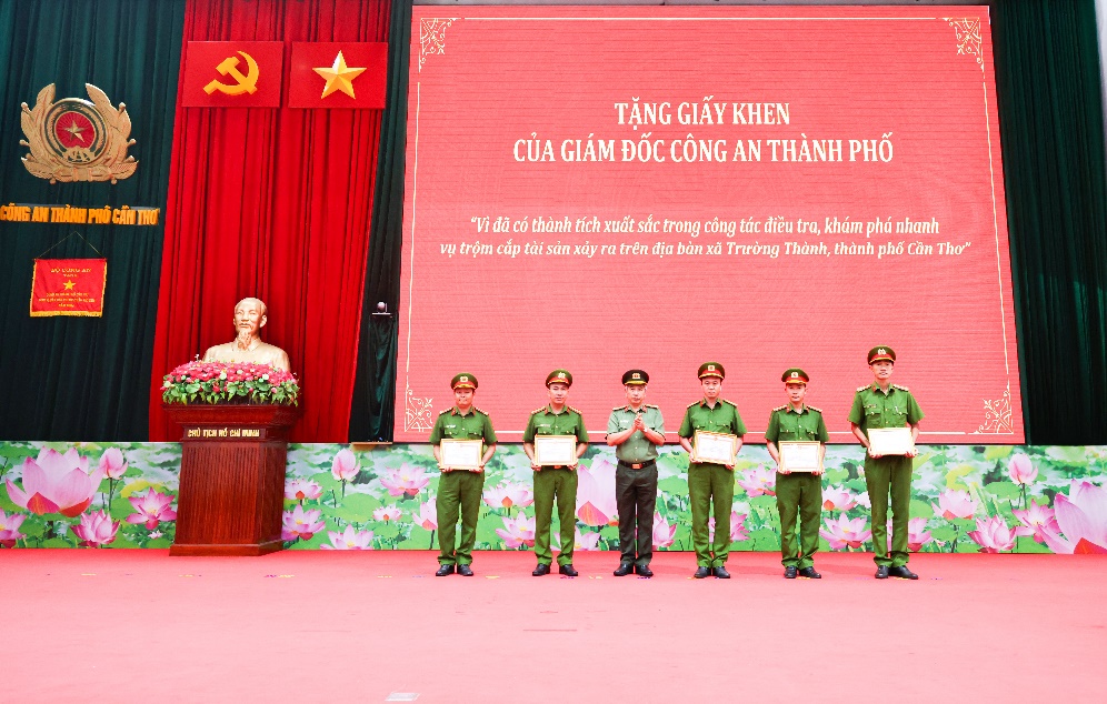 Đại tá Huỳnh Hoài Hận, Ủy viên Ban Thường vụ Đảng ủy, Phó Giám đốc Công an thành phố trao Giấy khen của Giám đốc Công an thành phố cho các tập thể, cá nhân có thành tích xuất sắc trong công tác điều tra, khám phá nhanh vụ trộm cắp tài sản xảy ra trên địa bàn xã Trường Thành, thành phố Cần Thơ.