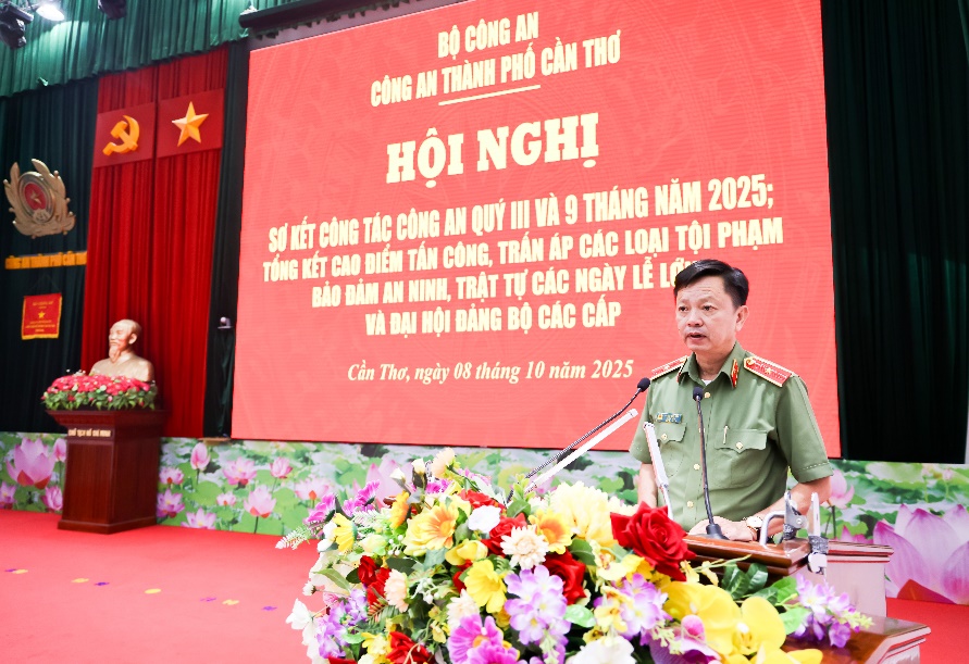 Ngày 08/10/2025, Công an thành phố Cần Thơ tổ chức Hội nghị sơ kết công tác Công an Quý III và 9 tháng năm 2025; tổng kết cao điểm tấn công, trấn áp các loại tội phạm, bảo đảm an ninh, trật tự các ngày lễ lớn và Đại hội Đảng bộ các cấp. Đồng chí Thiếu tướng Huỳnh Việt Hòa, Ủy viên Ban Thường vụ Thành ủy, Bí thư Đảng ủy, Giám đốc Công an thành phố chủ trì Hội nghị. Cùng dự có các đồng chí Phó Giám đốc Công an thành phố và khoảng 150 đại biểu là lãnh đạo, chỉ huy Công an các đơn vị, Công an xã, phường, Đồn Công an, Trưởng Ban Thanh niên, Ban Phụ nữ, Công đoàn Công an thành phố.