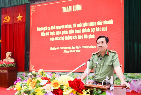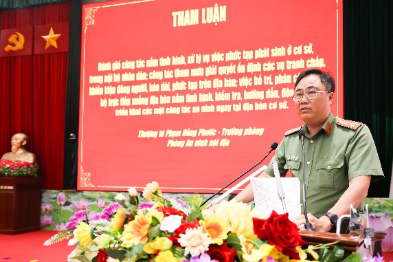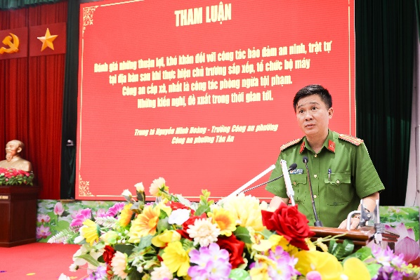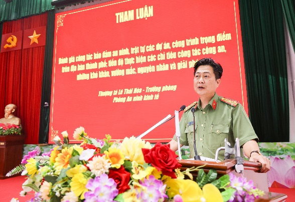 Đại tá Nguyễn Thanh Tràng, Ủy viên Ban Chấp hành Đảng bộ thành phố, Phó Bí thư Đảng ủy, Phó Giám đốc Công an thành phố phát biểu điều hành thảo luận.