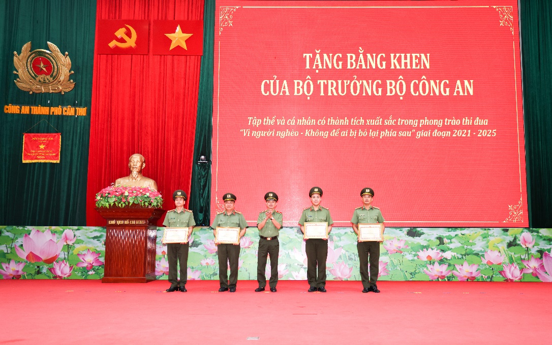 Thiếu tướng Huỳnh Việt Hòa, Ủy viên Ban Thường vụ Thành ủy, Bí thư Đảng ủy, Giám đốc Công an thành phố trao Bằng khen của Bộ trưởng Bộ Công an cho tập thể, cá nhân có thành tích xuất sắc trong phong trào thi đua “Vì người nghèo - Không để ai bị bỏ lại phía sau” giai đoạn 2021 - 2025.