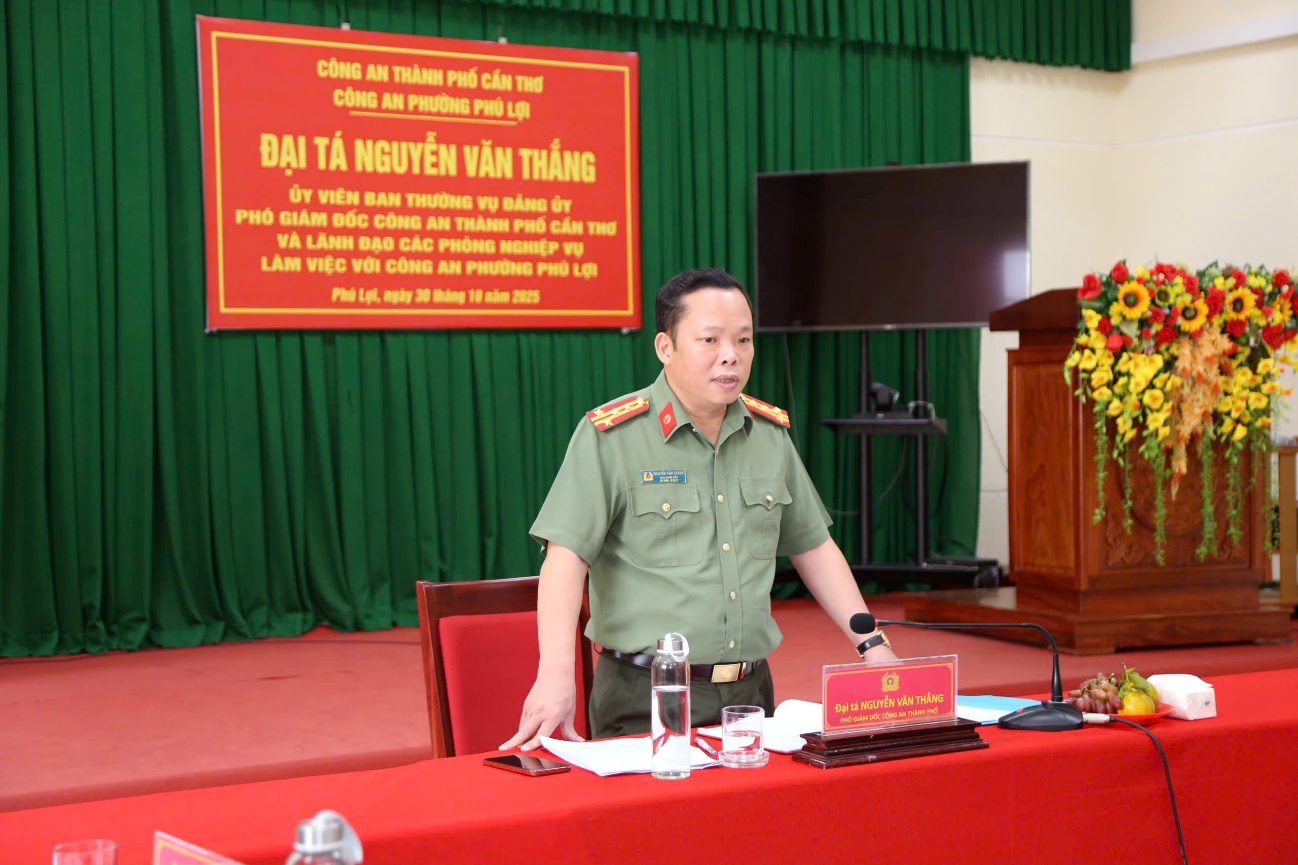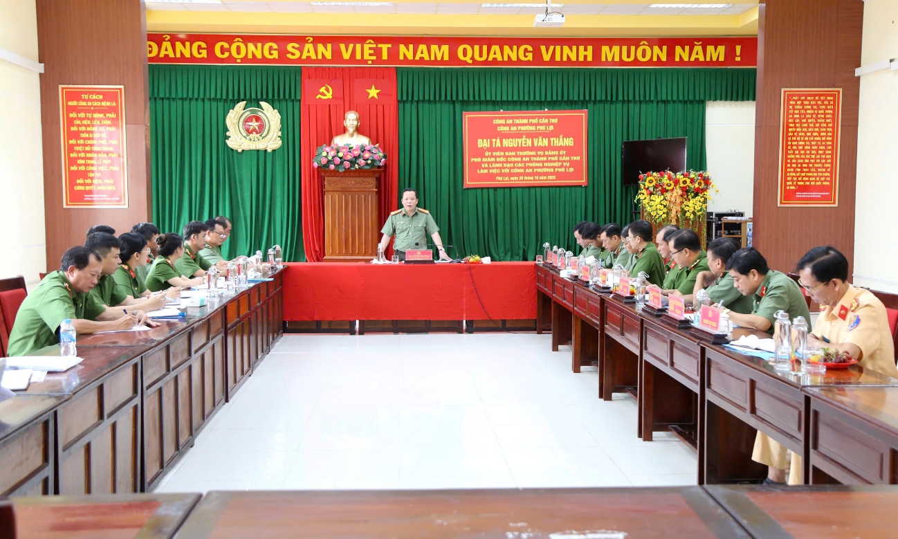 Phát biểu chỉ đạo tại buổi làm việc, Đại tá Nguyễn Văn Thắng yêu cầu Công an phường Phú Lợi tiếp tục triển khai thực hiện có hiệu quả các chỉ tiêu công tác còn lại. Làm tốt công tác nắm tình hình, quản lý chặt chẽ địa bàn, đối tượng. Tập trung thực hiện công tác nghiệp vụ cơ bản. Tăng cường kiểm tra công tác phòng cháy, chữa cháy và trật tự đô thị, tổ chức tuần tra khép kín địa bàn, kịp thời phát hiện, đấu tranh, ngăn chặn tội phạm. Nâng cao hiệu quả công tác phối hợp với các ban, ngành, đoàn thể và các đơn vị nghiệp vụ trong công tác phòng ngừa, đấu tranh và xử lý kịp thời các hành vi vi phạm pháp luật, không để bị động, bất ngờ, giải quyết dứt điểm các vụ việc ngay từ cơ sở, không để tồn đọng, kéo dài. Đẩy mạnh tuyên truyền thông tin tích cực, phòng ngừa, đấu tranh phản bác, ngăn chặn, xử lý thông tin xấu độc, các quan điểm sai trái, thù địch, chống phá Đại hội đảng bộ các cấp và Đại hội đại biểu lần thứ XIV của Đảng. Đảm bảo tuyệt đối an toàn hoạt động của các đồng chí lãnh đạo Đảng, Nhà nước đến thăm và làm việc tại phường, các mục tiêu, địa bàn trọng điểm, các sự kiện chính trị, văn hoá, xã hội diễn ra trên địa bàn, trước mắt là bảo đảm an ninh trật tự các hoạt động của Lễ hội Óoc Om Bóc - Đua ghe Ngo thành phố Cần Thơ./.