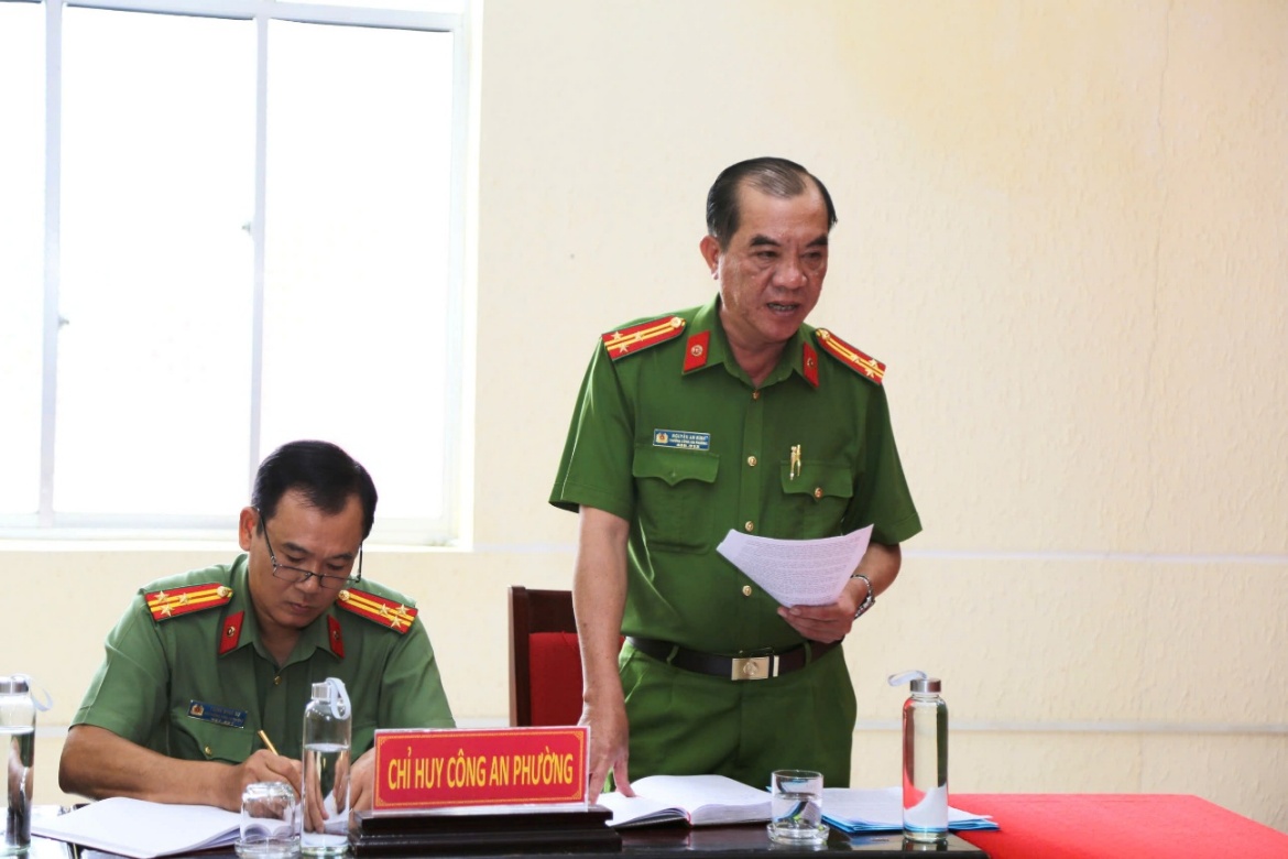 Thượng tá Nguyễn An Bình, Trưởng Công an phường Phú Lợi báo cáo cáo tình hình, kết quả công tác của đơn vị